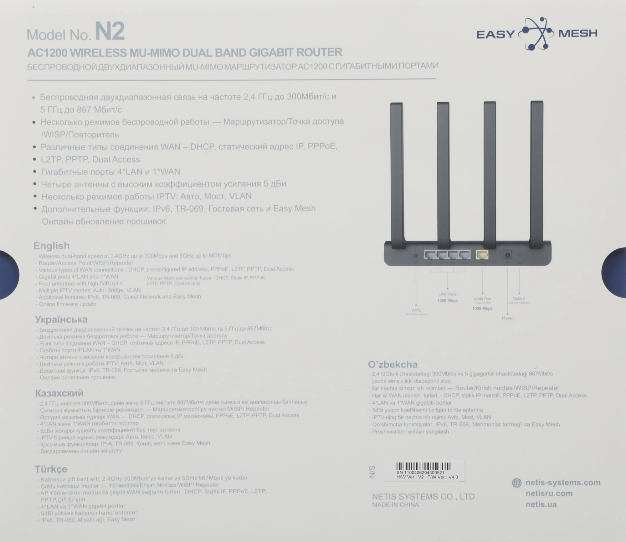 Невысокая стоимость и техническое оснащение делает netis N2 одним из лучших решений для организации высокоскоростного проводного и беспроводного доступа в сеть. Хорошее качество покрытия с четырьмя антеннами, гигабитные порты, мощный процессор, локализованный интерфейс с детальными настройками.