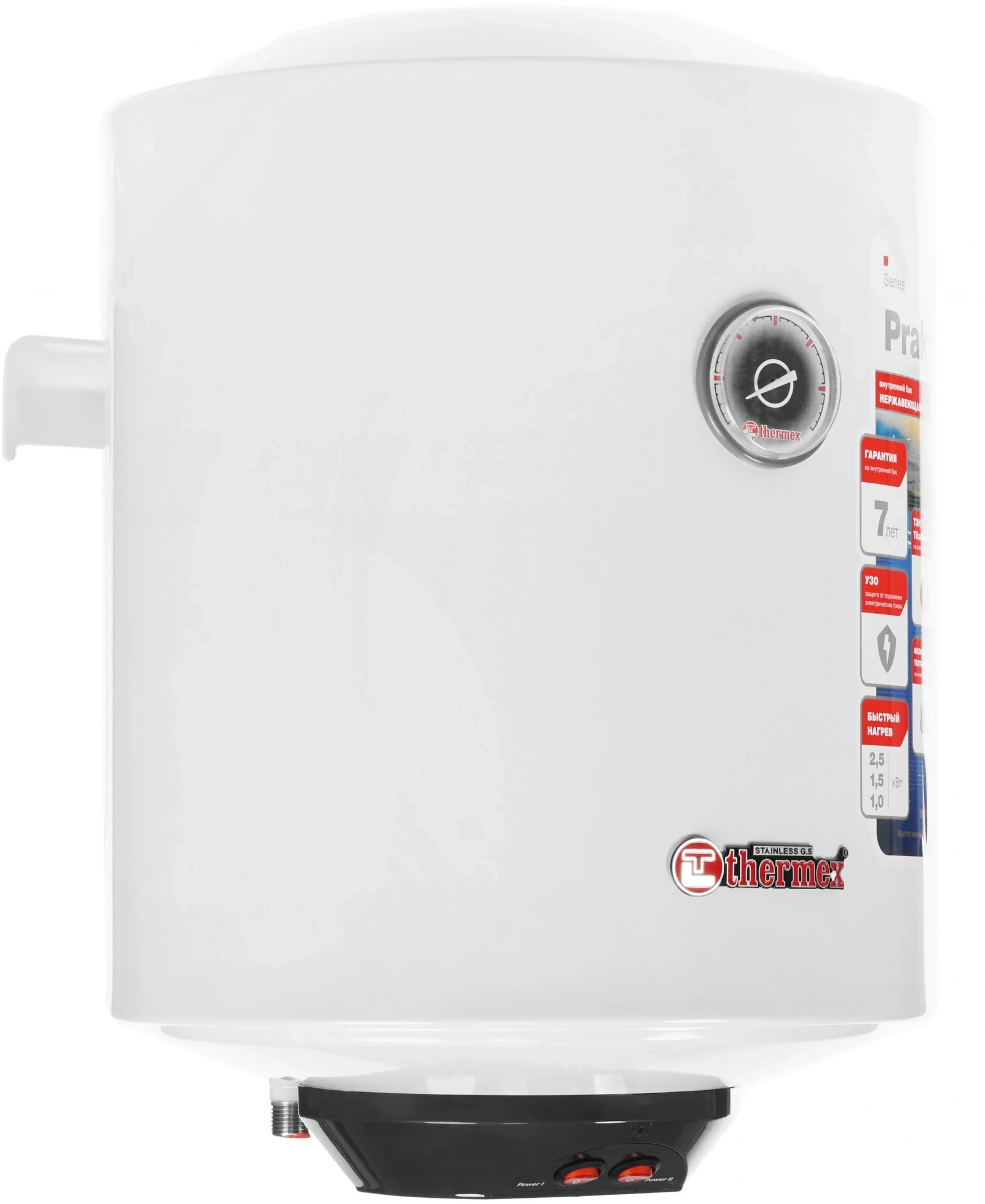 Нагреватель в оригинальном круглом корпусе.. Внутренний резервуар изготовлен из нержавеющей стали и оснащен трубчатыми электронагревателями повышенной мощности.