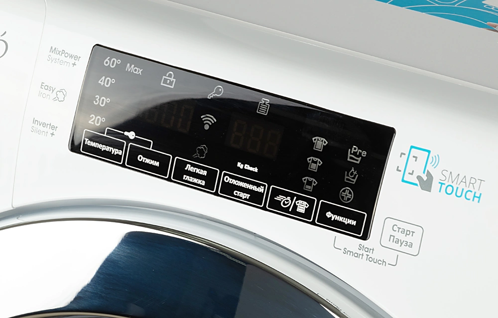 времени до конца программы, звуковой сигнал окончания стирки, режима работы