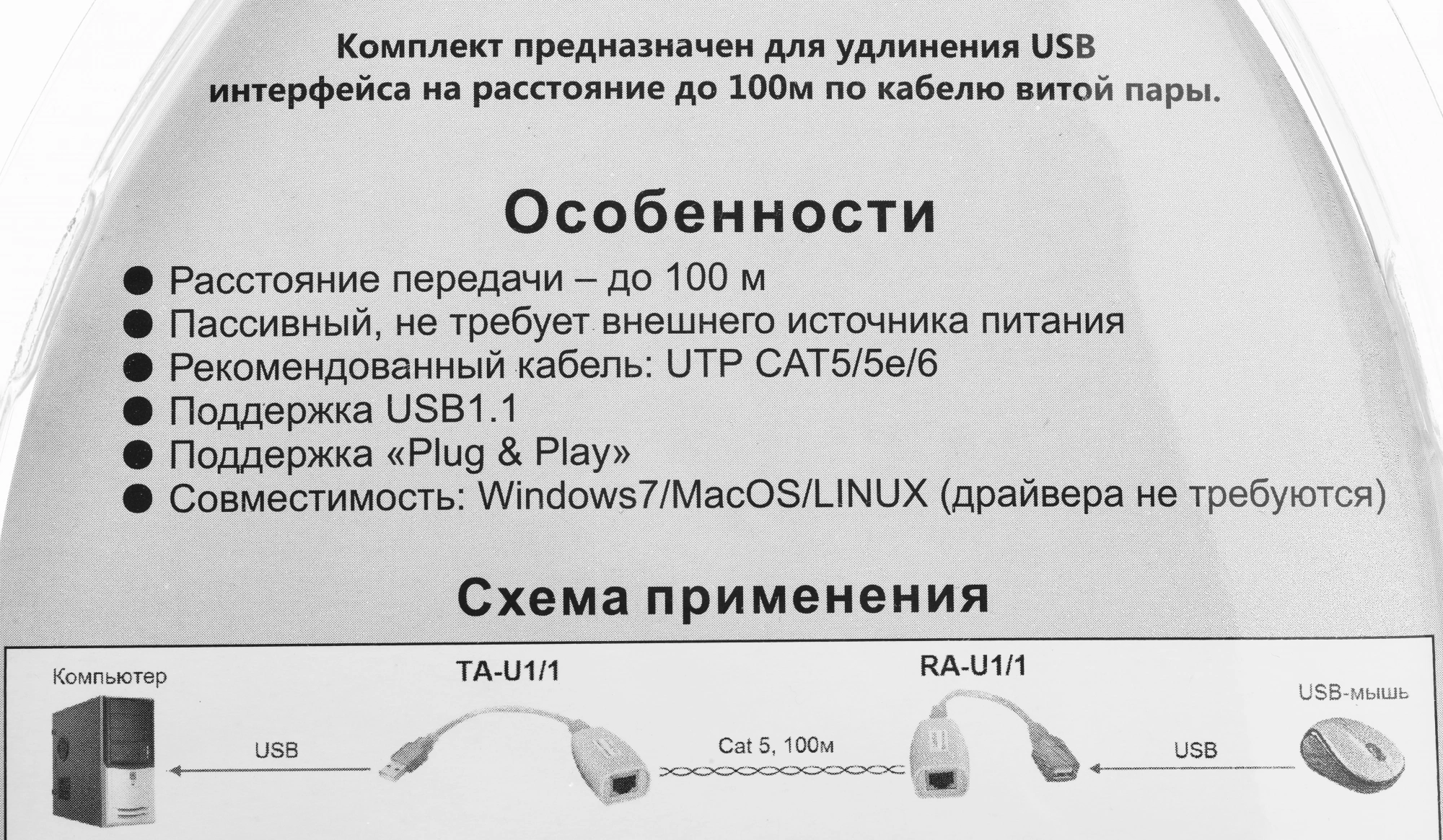 Удлинитель USB 1.1 интерфейса для клавиатуры и мыши по кабелю витой пары (CAT5/5e/6) до 100м, USB звуковые платы и т.д. до 70 м