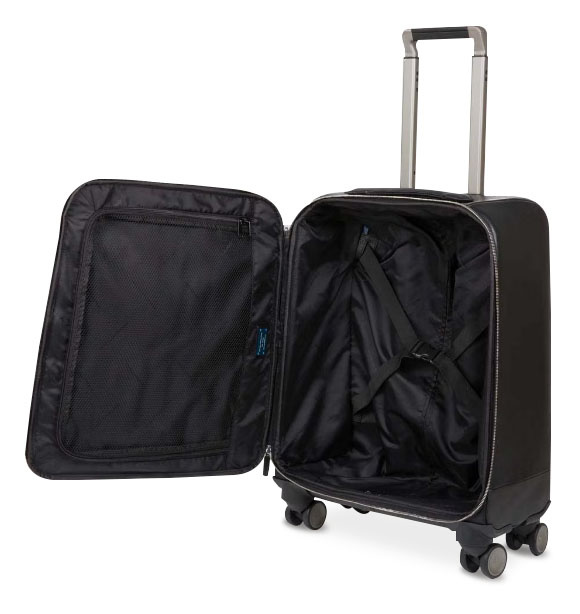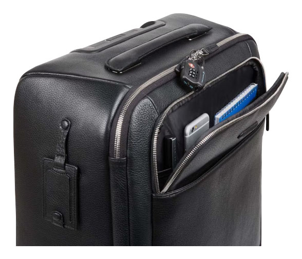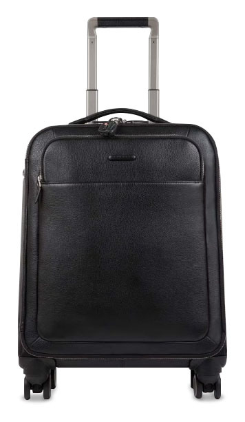 Чемодан кожаный из коллекции Piquadro Modus. Изготовлен из зернистой кожи черного цвета. Имеет одно основное отделение и карманы для ноутбука, телефона и письменных принадлежностей. Четыре бесшумных колеса позволяют легко перемещать данный чемодан. Отличный вариант для командировок и деловых поездок