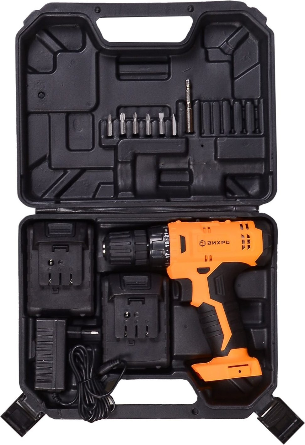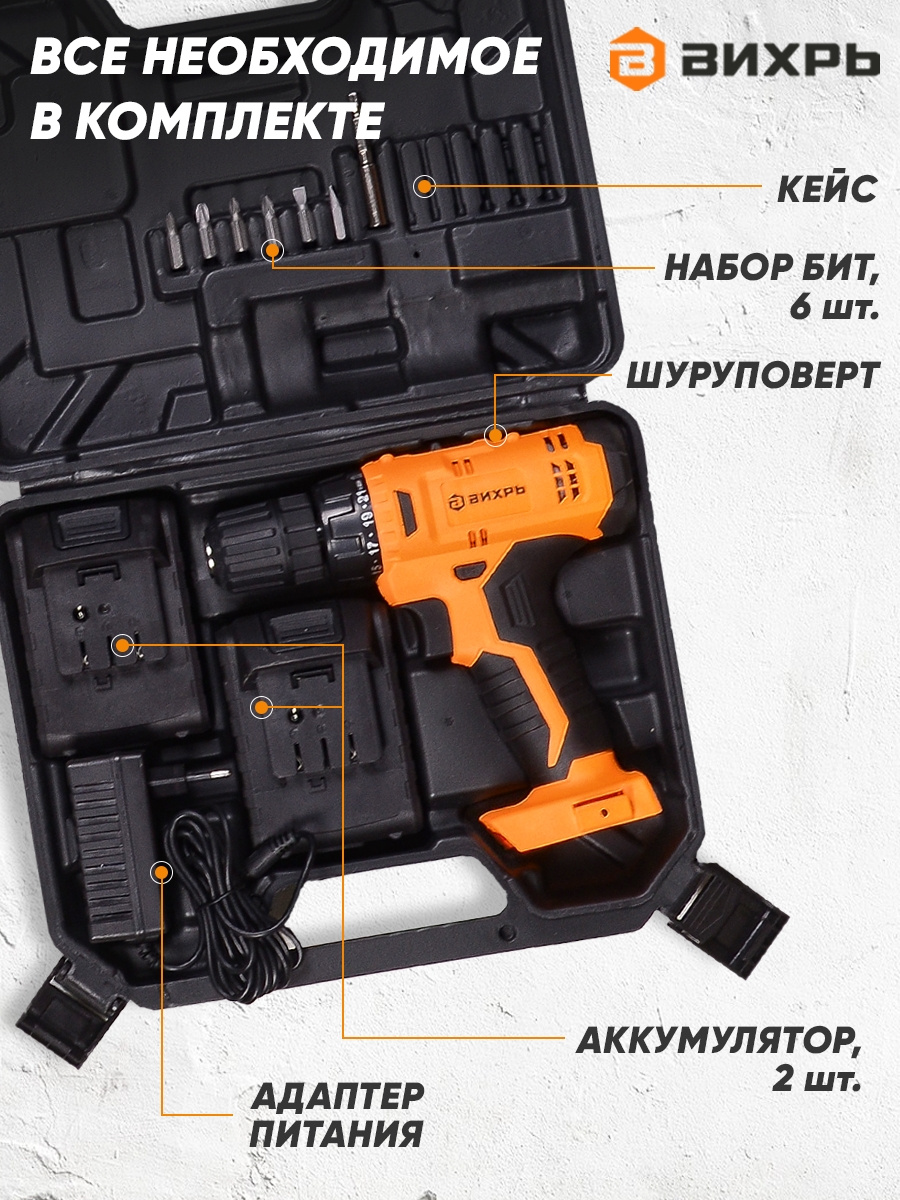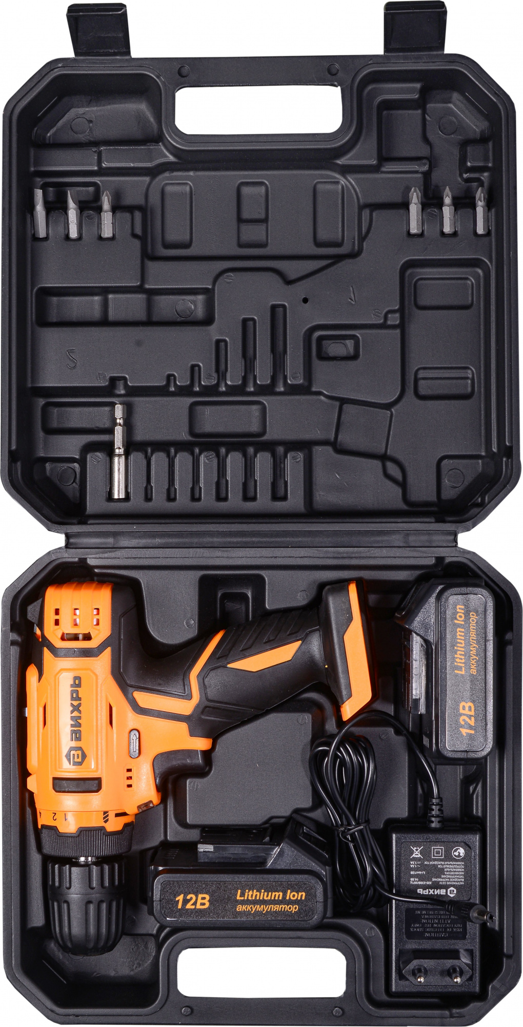 Дрель-шуруповерт, 2 аккумуляторные батареи, зарядное устройство, бита – 6 шт., удлинитель для бит, кейс