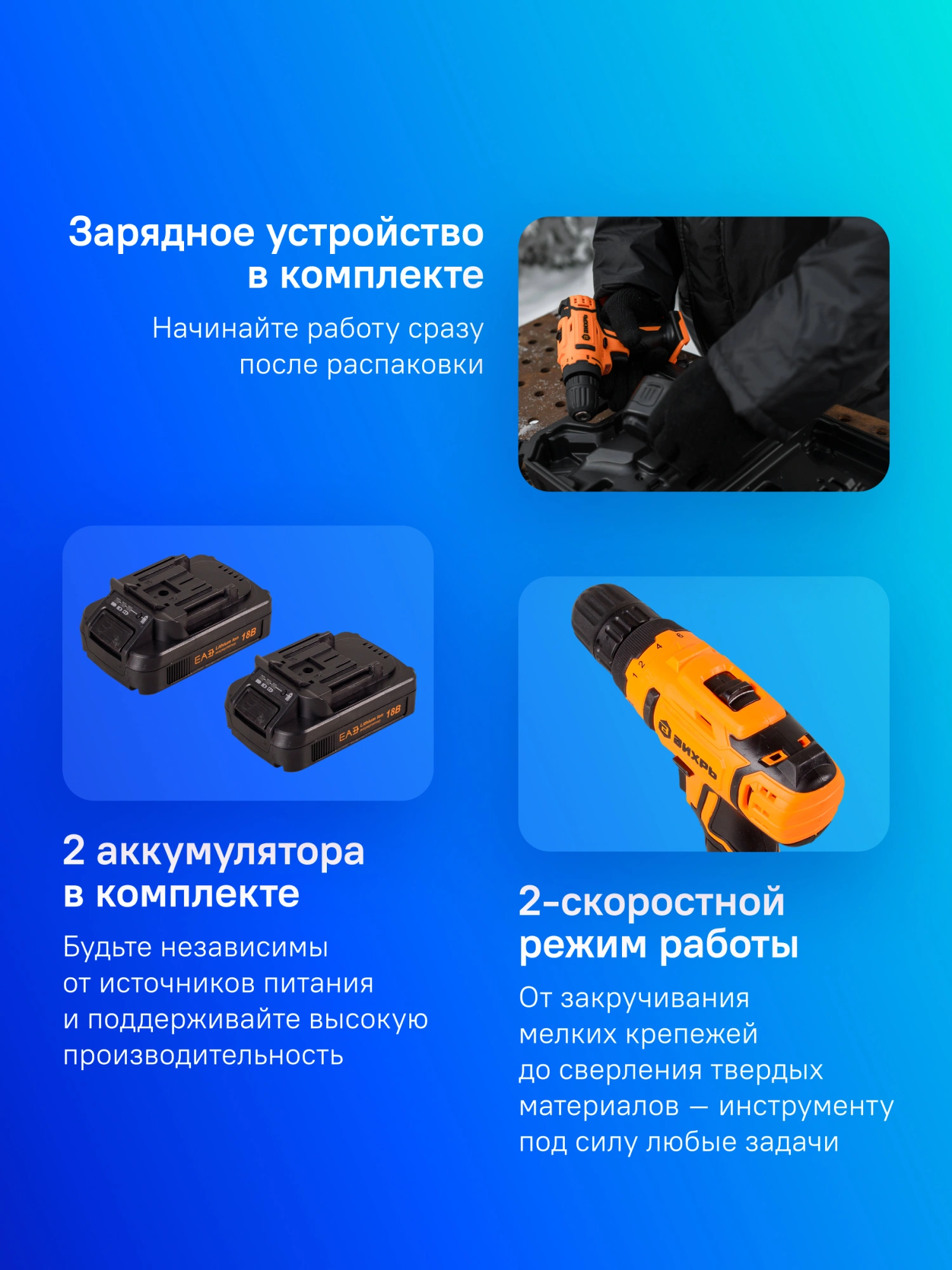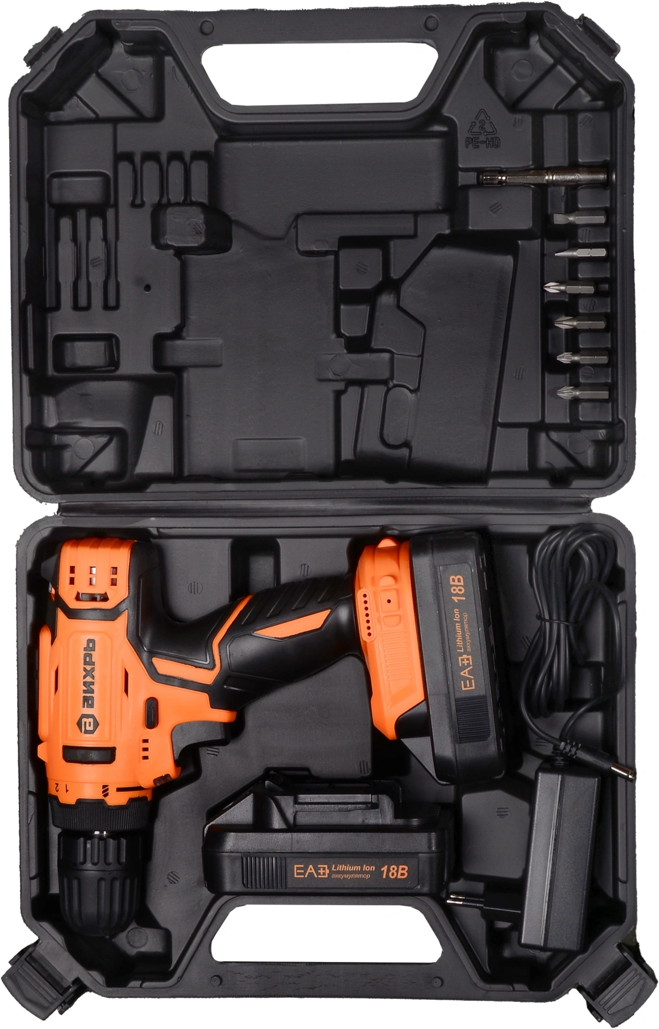 Дрель-шуруповерт, 2 аккумуляторных батареи, зарядное устройство, бита - 6шт., удлинитель для бит, кейс