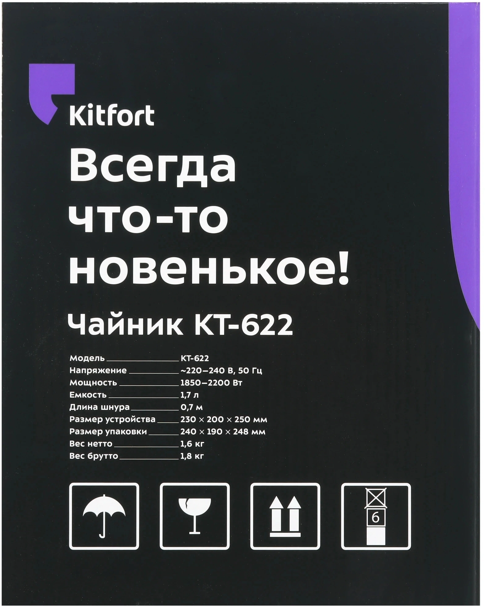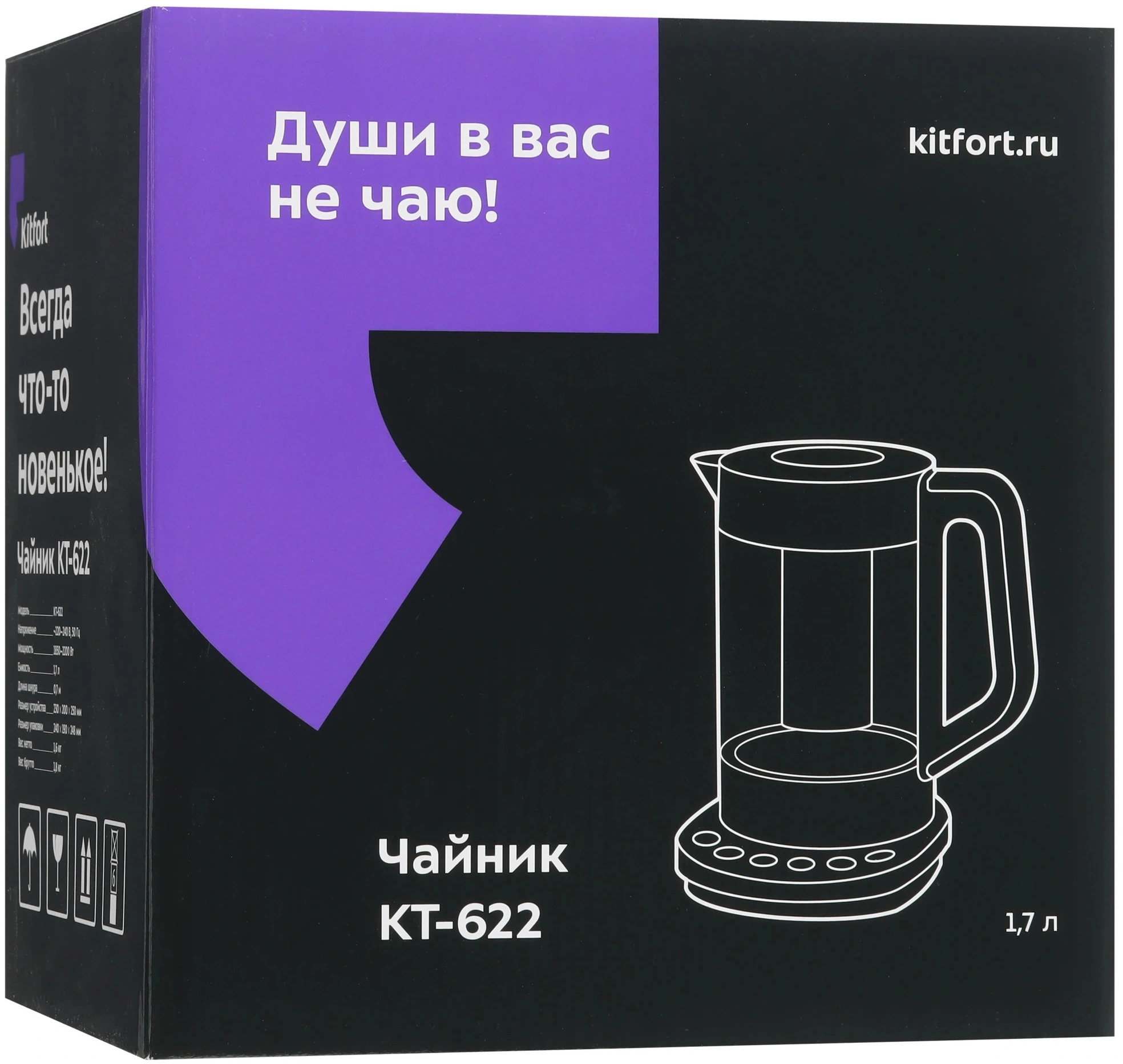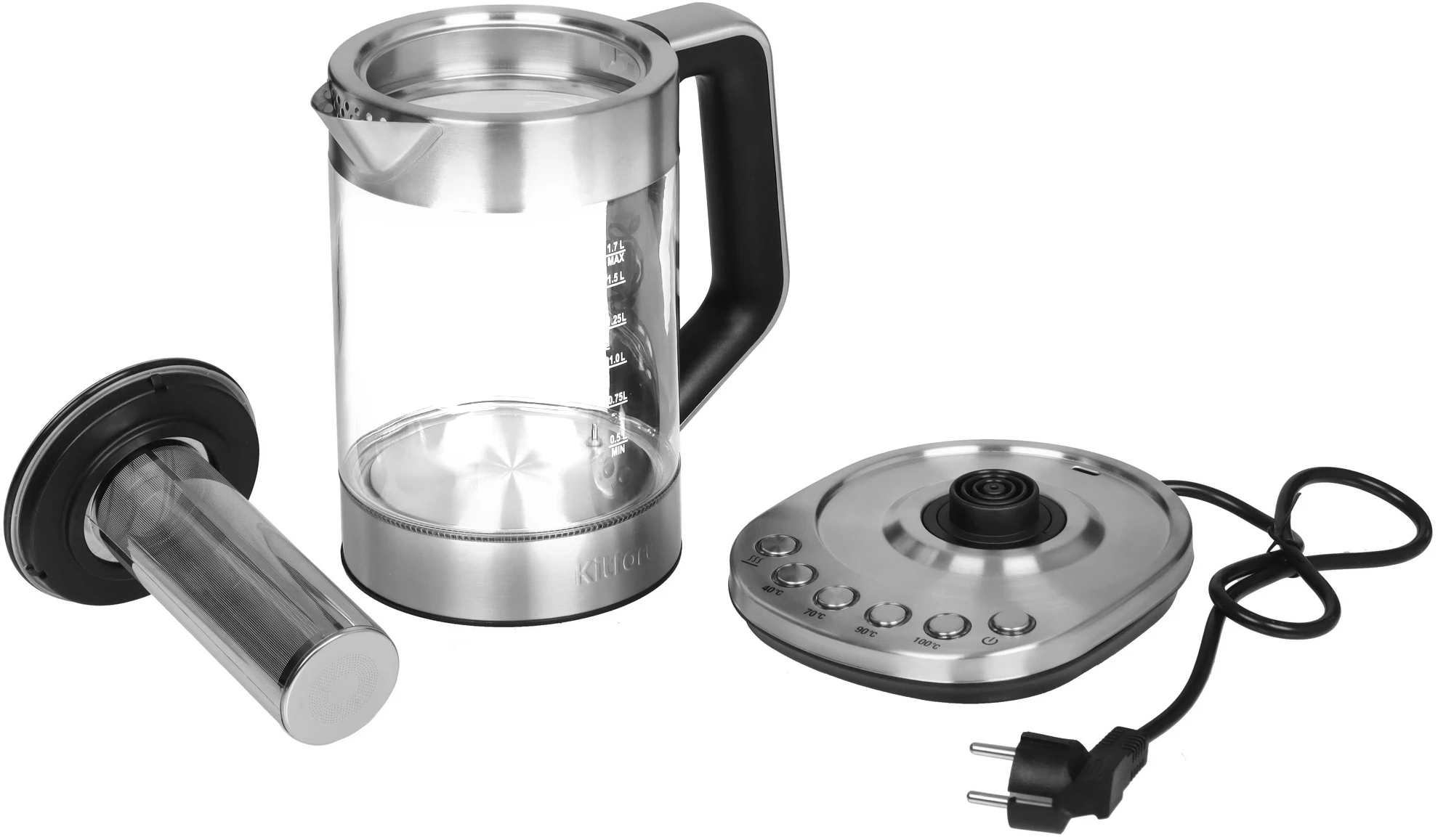внутренний заварник, звуковой сигнал при закипании, кнопка открытия крышки, отсек для шнура, подсветка воды, подставка 360