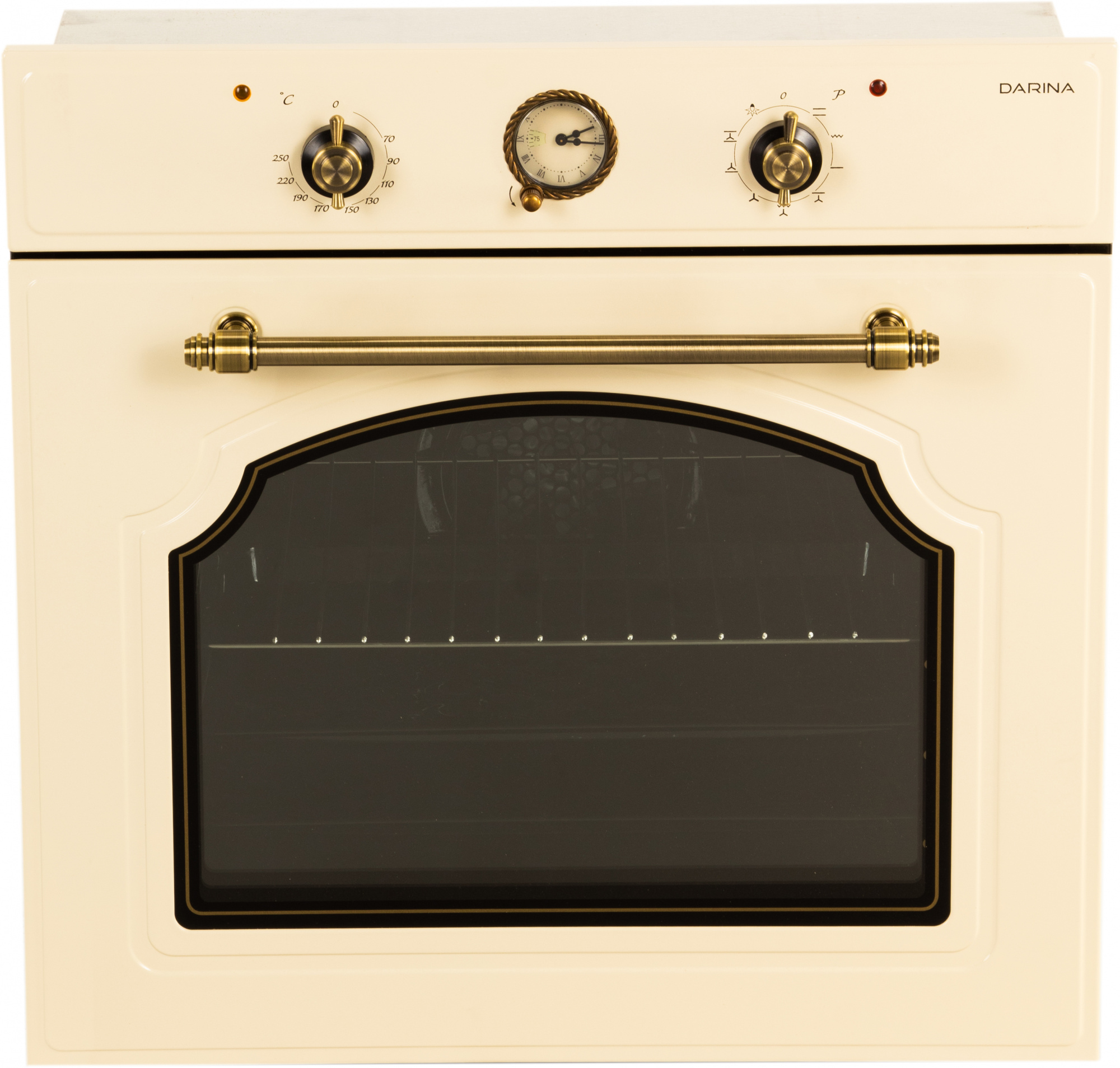 Встраиваемый электрический шкаф с металлическим фасадом бежевого цвета в стиле Прованс, 9 режимов работы, тангенциальное охлаждение, часы-таймер, подсветка, конвектор, гриль, терморегулятор.