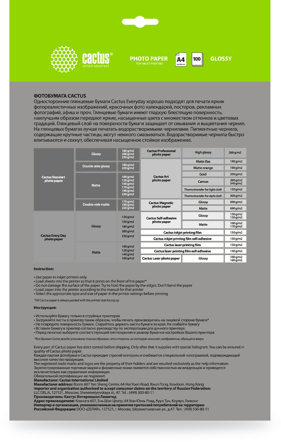 Глянцевая фотобумага Cactus серии Every Day для струйной печати. Идеально подойдет для повседневного использования и экономичного режима цветной печати. На глянцевой бумаге рекомендуется печатать водорастворимыми чернилами. Поры покрытия мелкие и не пропускают частицы некоторых видов пигментных чернил, поэтому пигментные чернила могут немного смазываться. Водорастворимые чернила быстро впитываются и закрепляются, создавая яркое и насыщенное изображение.
