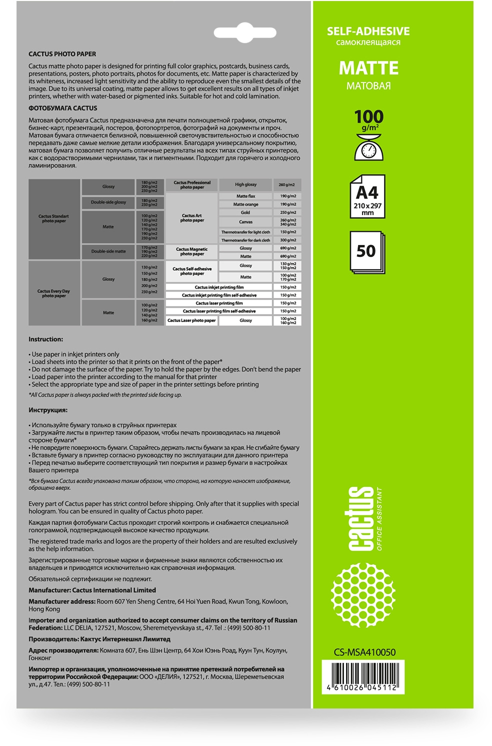 Фотобумага Cactus CS-MSA410050 A4/100г/м2/50л./белый матовое самоклей. для струйной печати
