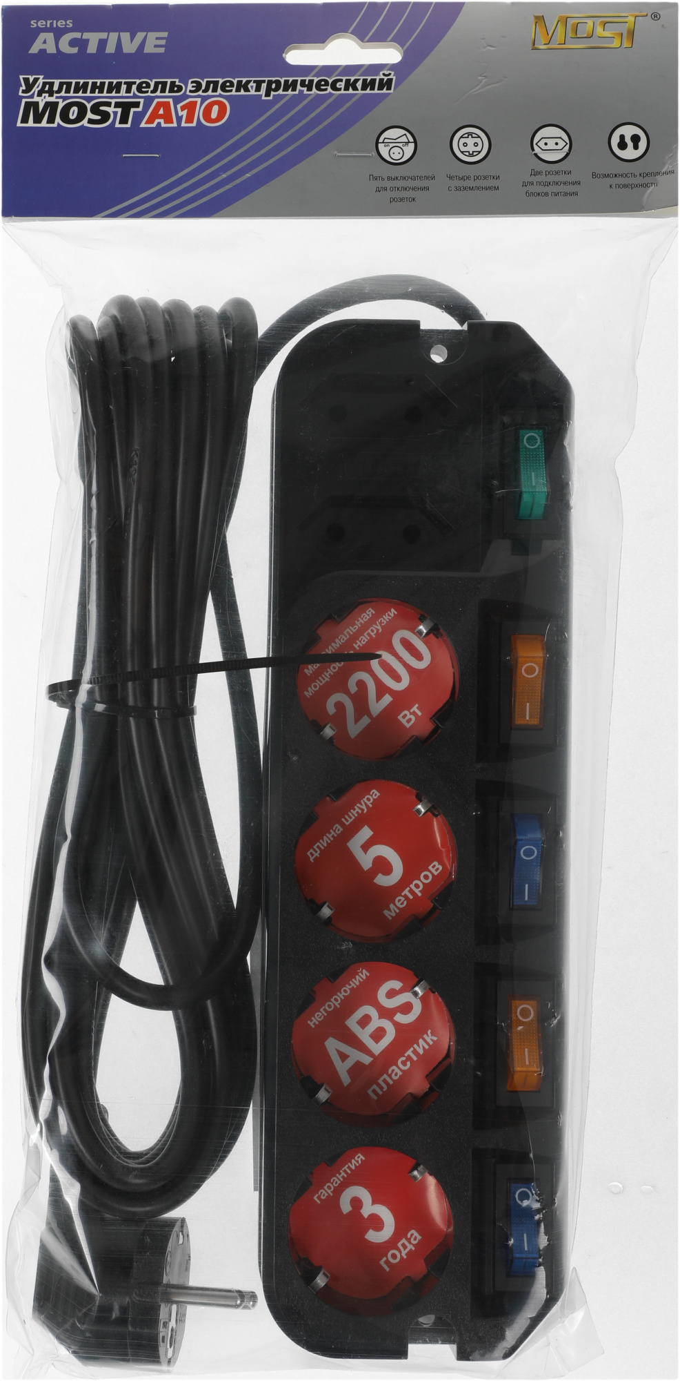 Удлинитель Most А10 предназначен для подключения бытовой техники к сети электропитания.У каждой из четырех евророзеток имеется мощный (16A) индивидуальный выключатель,который обеспечивает удобство обращения с электропитанием и экономит Ваше время. Две узкие розетки имеют общий выключатель.