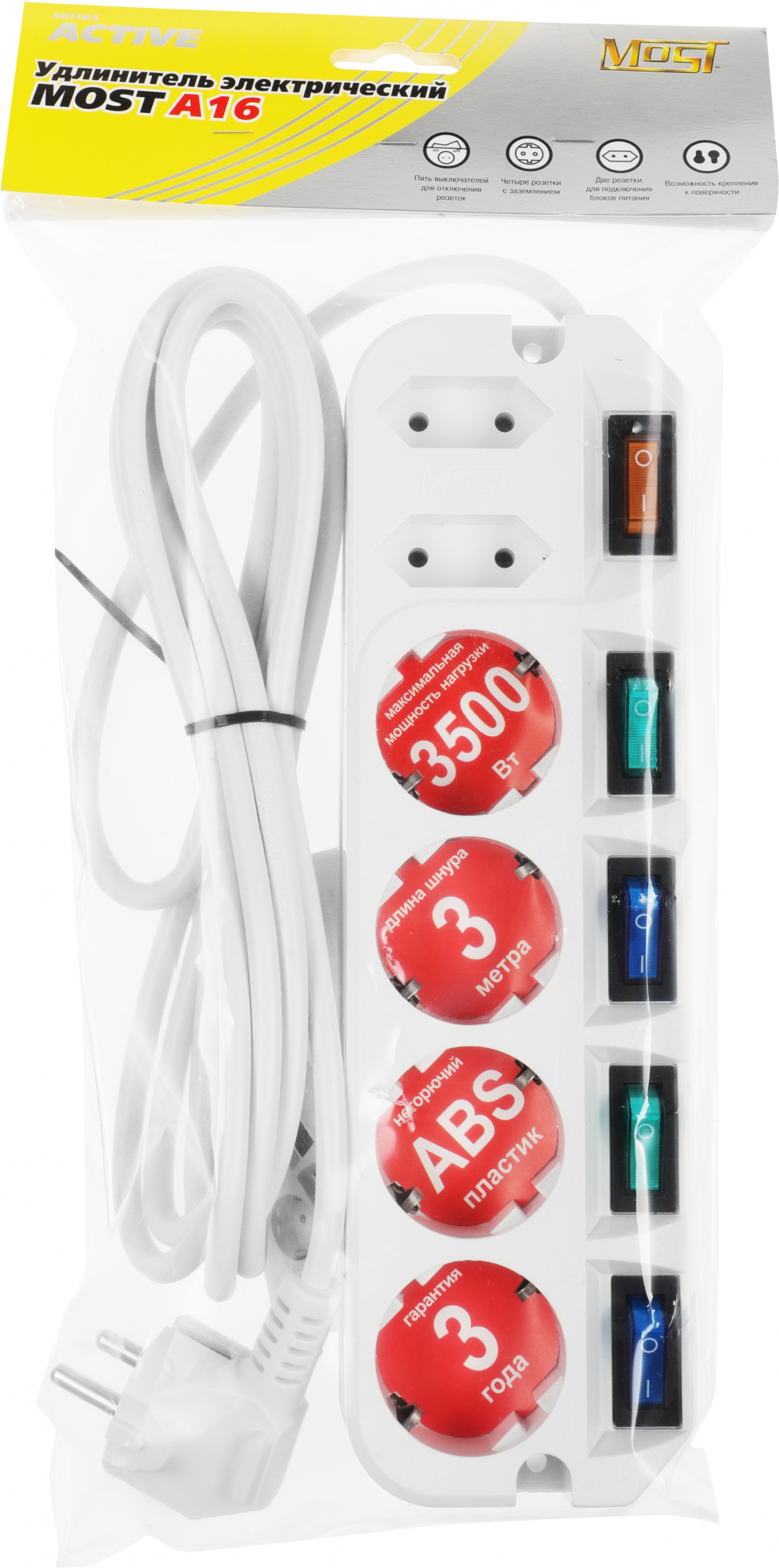 Удлинитель Most А16 предназначен для подключения бытовой техники к сети электропитания. У каждой из четырех евророзеток имеется мощный (16A) индивидуальный выключатель,который обеспечивает удобство обращения с электропитанием и экономит Ваше время. Две узкие розетки имеют общий выключатель.