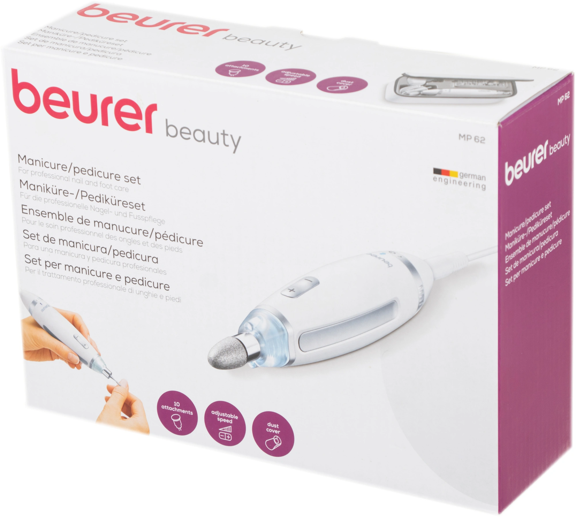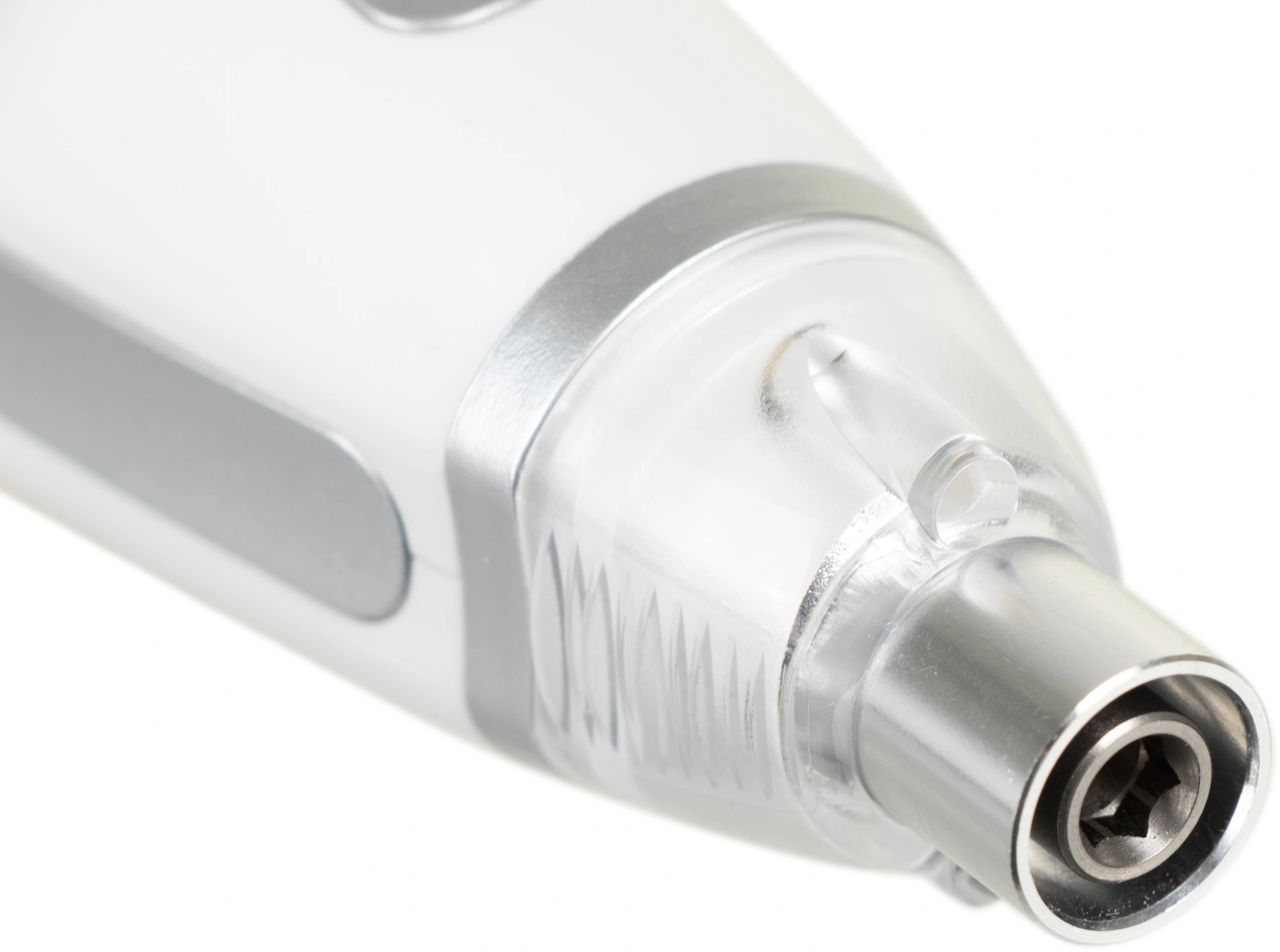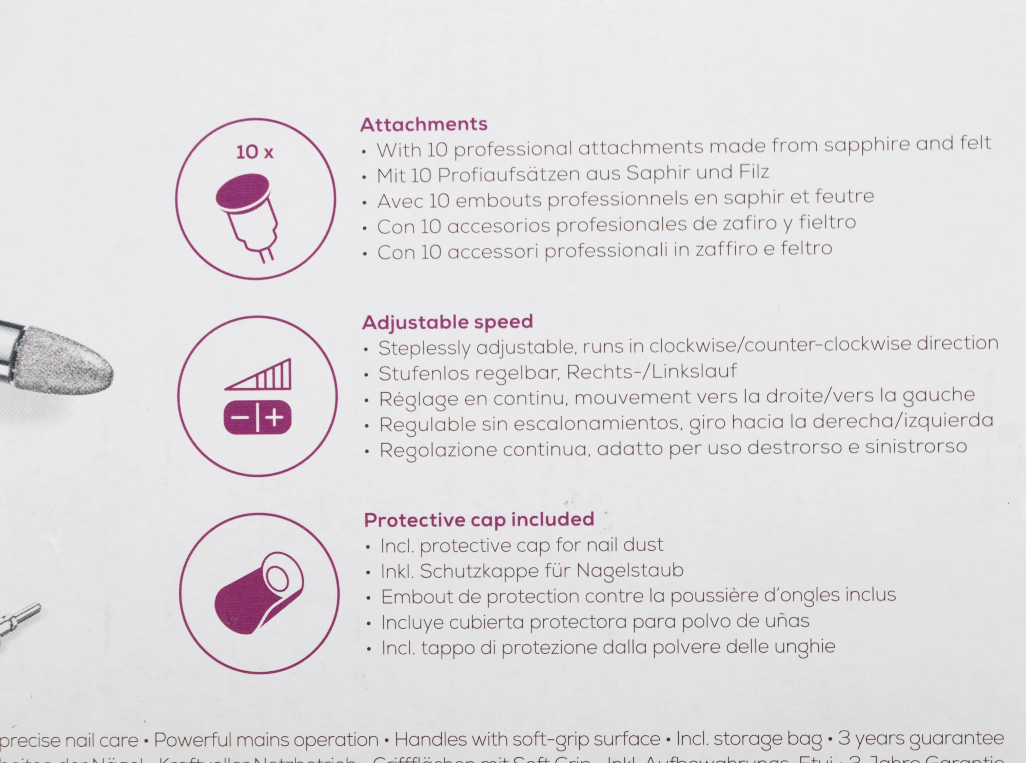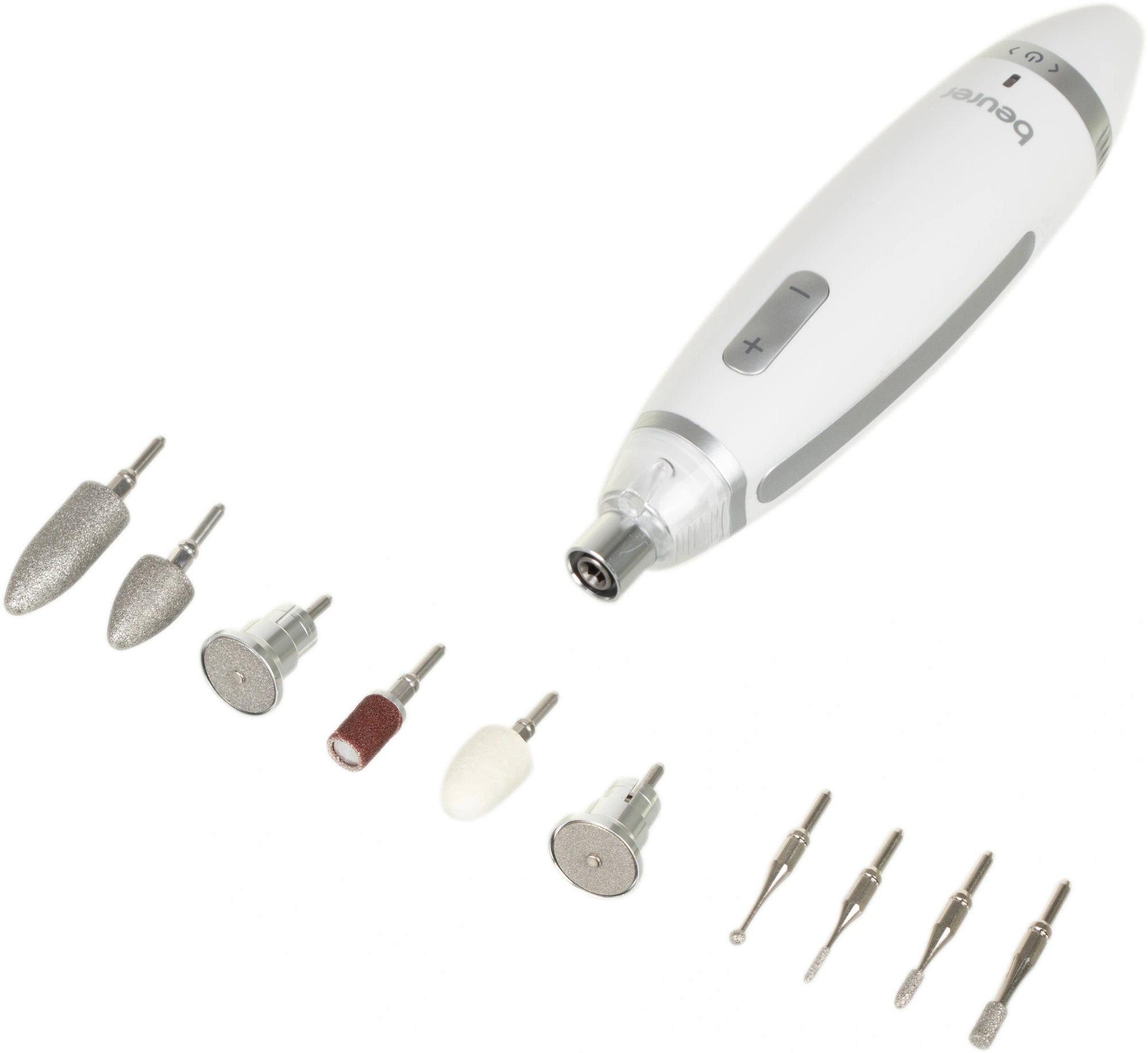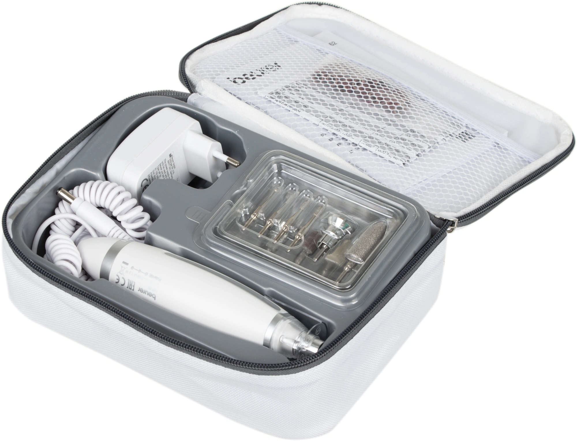 Прибор со светодиодной подсветкой для профессионального ухода за ногтями и стопами. Вращение по или против часовой стрелки. Подходит для людей, страдающих сахарным диабетом. Практичная сумка для хранения. Мощный привод с питанием от сети. Частота вращения: 2.000-5.400 ±20% об/мин.