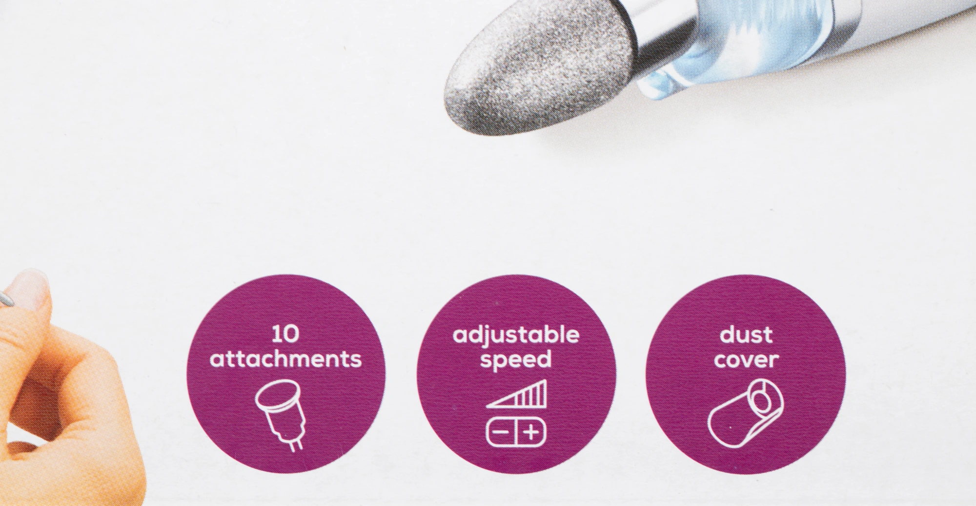 Аппарат для профессионального ухода за ногтями и стопами, яркая светодиодная лампа. Вращение по или против часовой стрелки, плавная регулировка. 10 высококачественных сапфировых и войлочных насадок. С защитным колпачком от ногтевой пыли. Светодиодная подсветка.