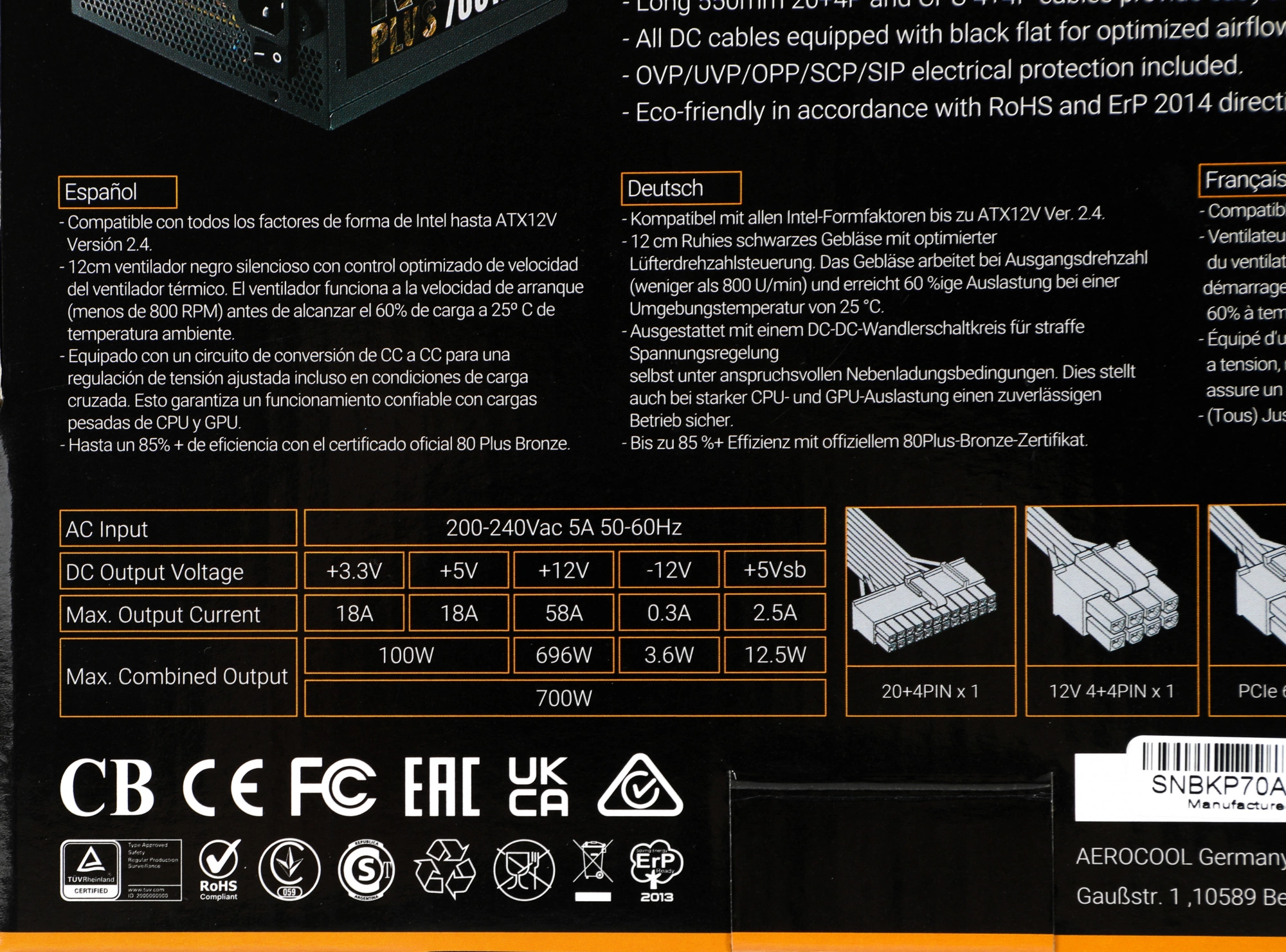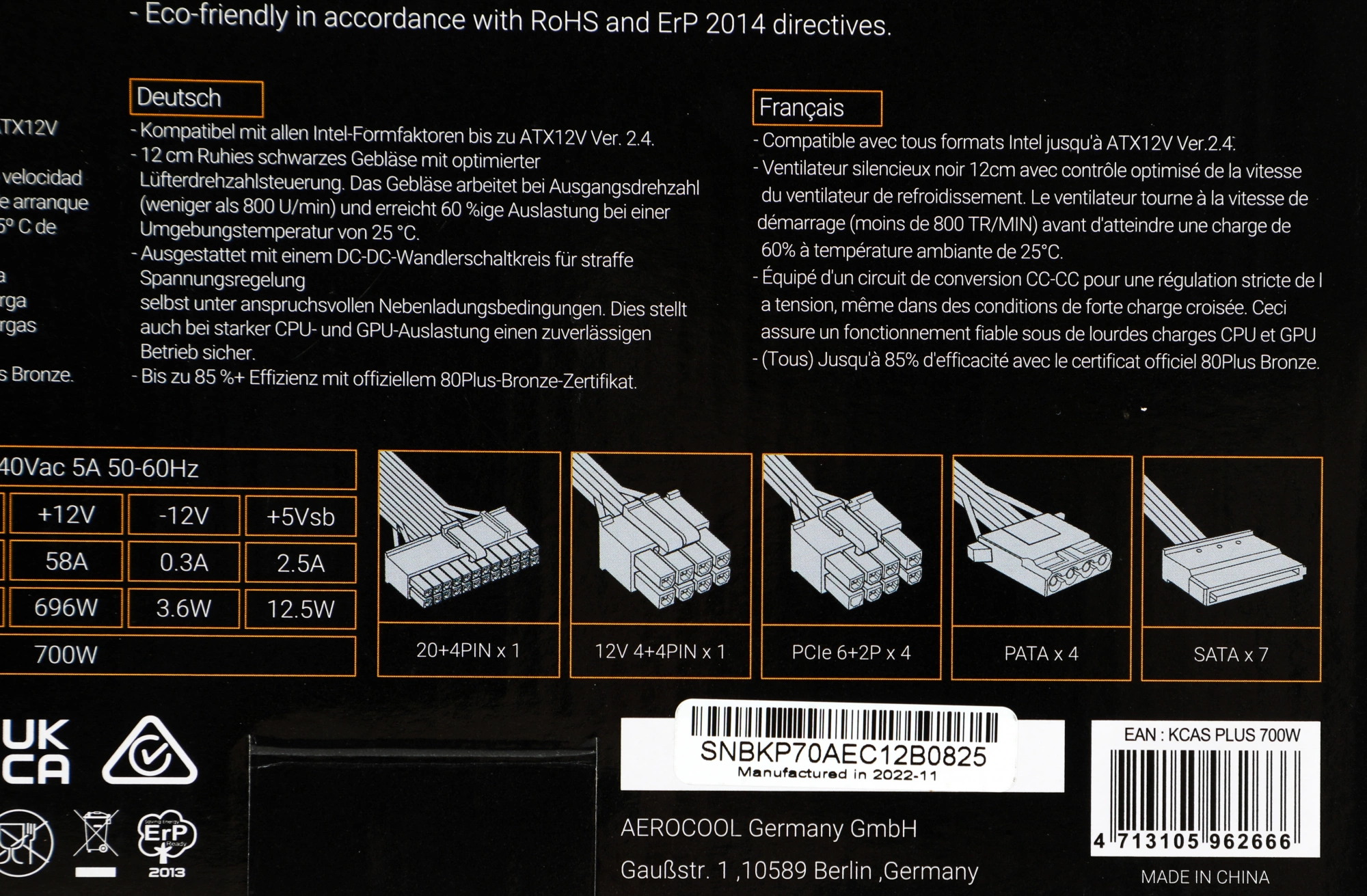 Блок питания Aerocool ATX 700W KCAS PLUS 700