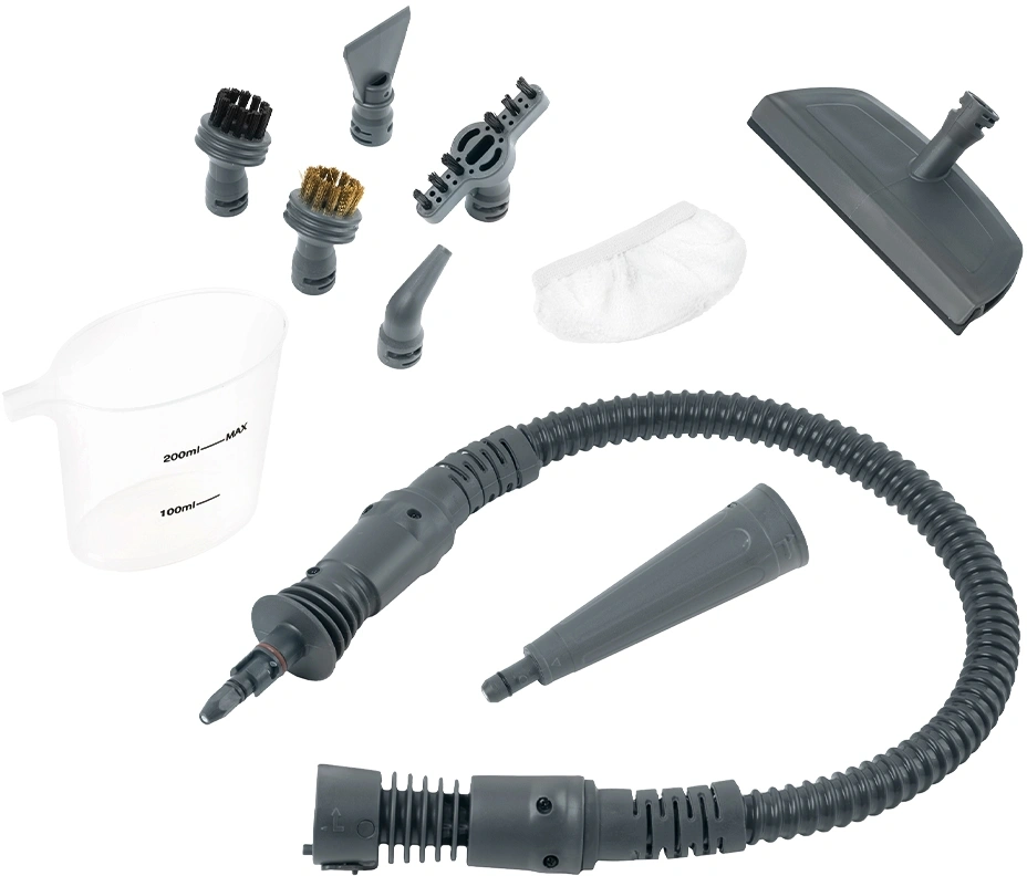 Стакан для воды, съёмный паровой шланг, тряпка для отпаривания, защелка шланга.