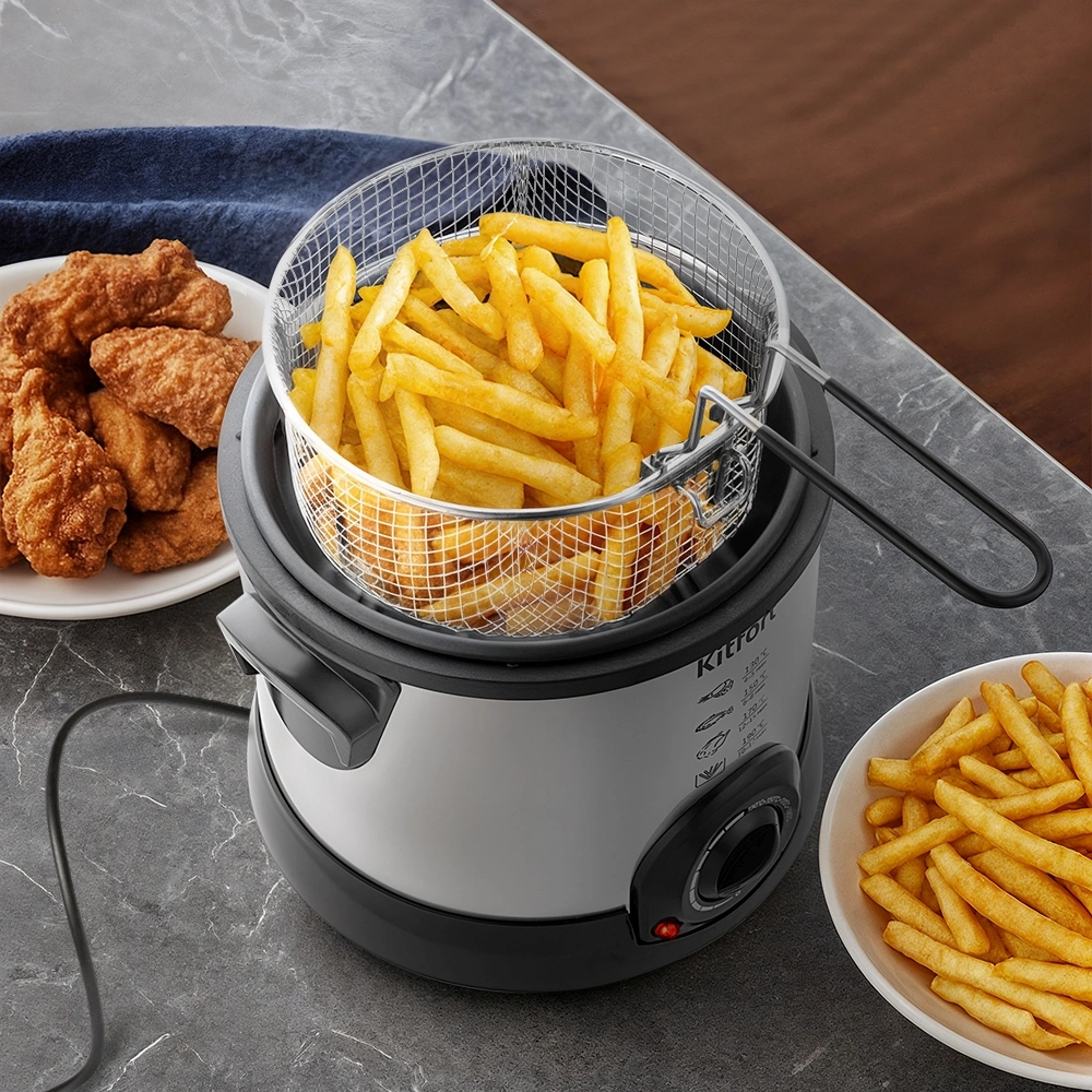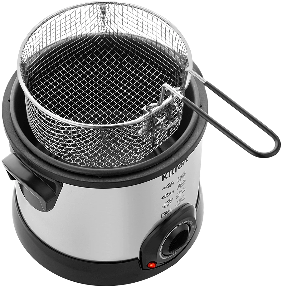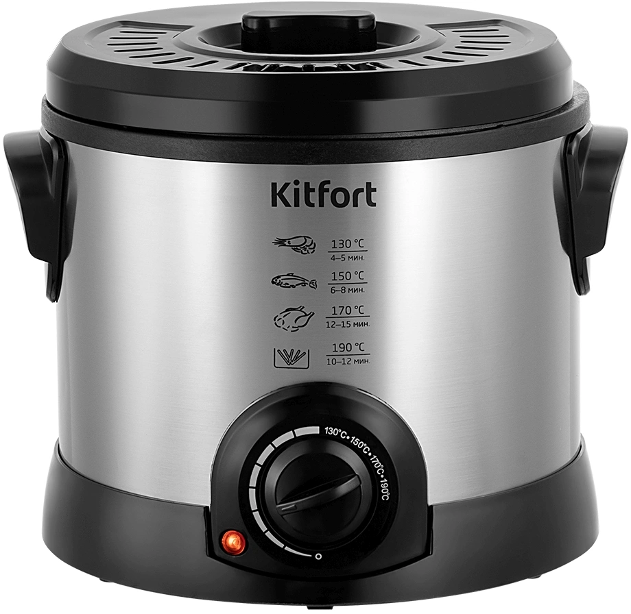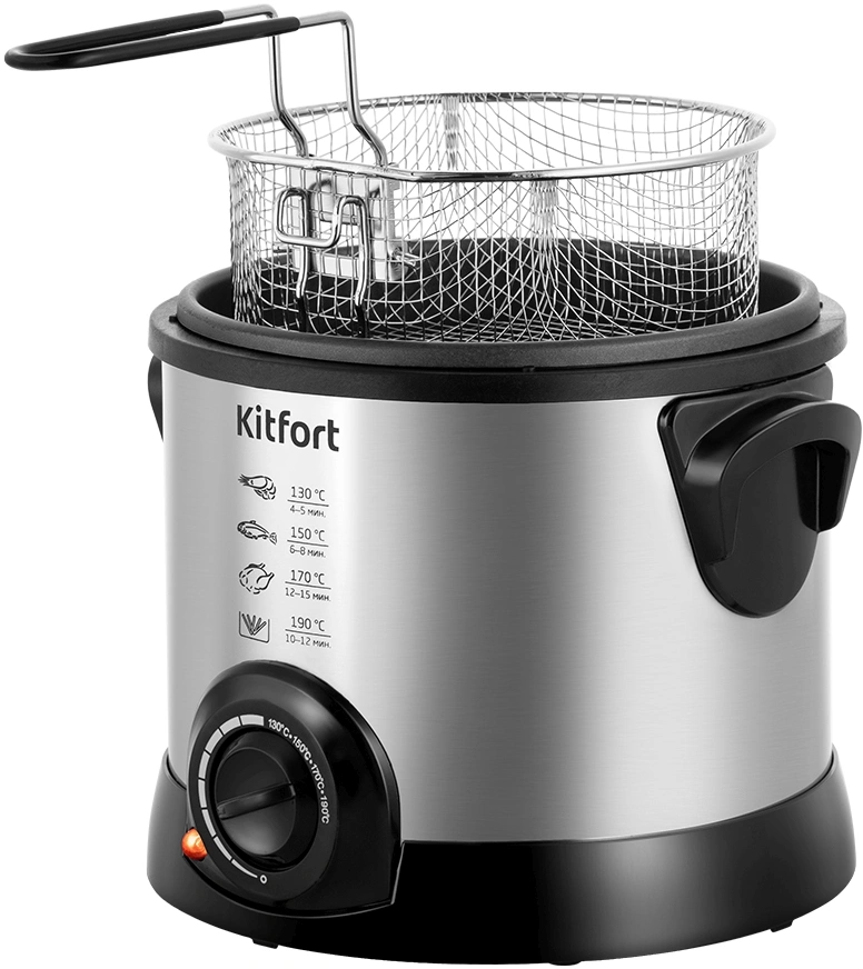 Во фритюрнице Kitfort KT-2011 продукты жарятся в глубоком слое горячего масла. С помощью термостата вы можете плавно регулировать температуру приготовления. Чаша фритюрницы несъёмная, покрыта антипригарным покрытием.