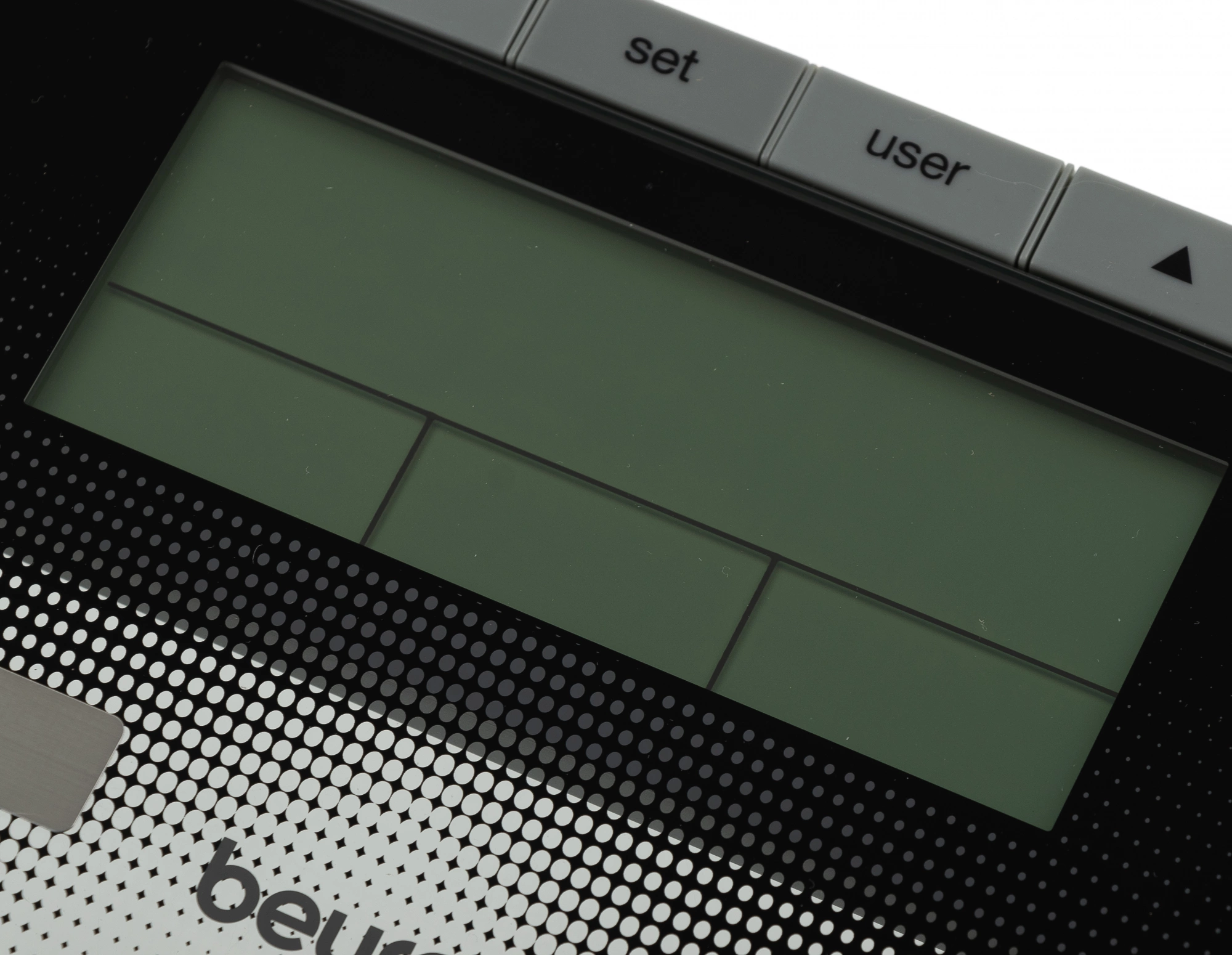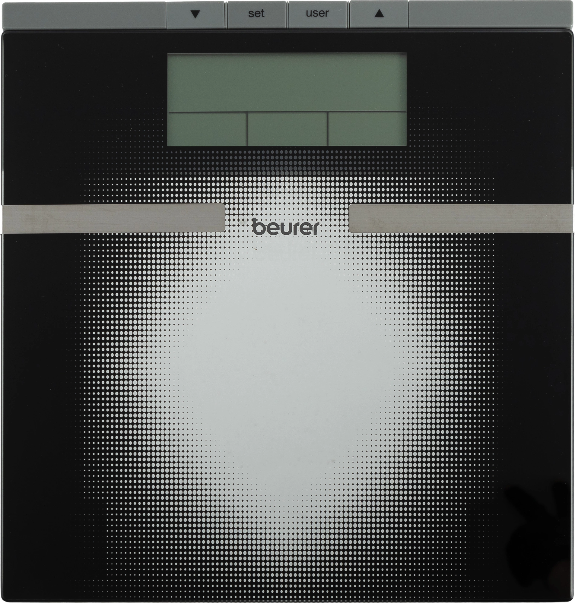 Графический печатный мотив с прозрачным «окошком». Определение веса тела, внутреннего жира, тканевой жидкости и доли мышц, массы костей, расчет расхода энергии. Электроды из полированной нержавеющей стали.