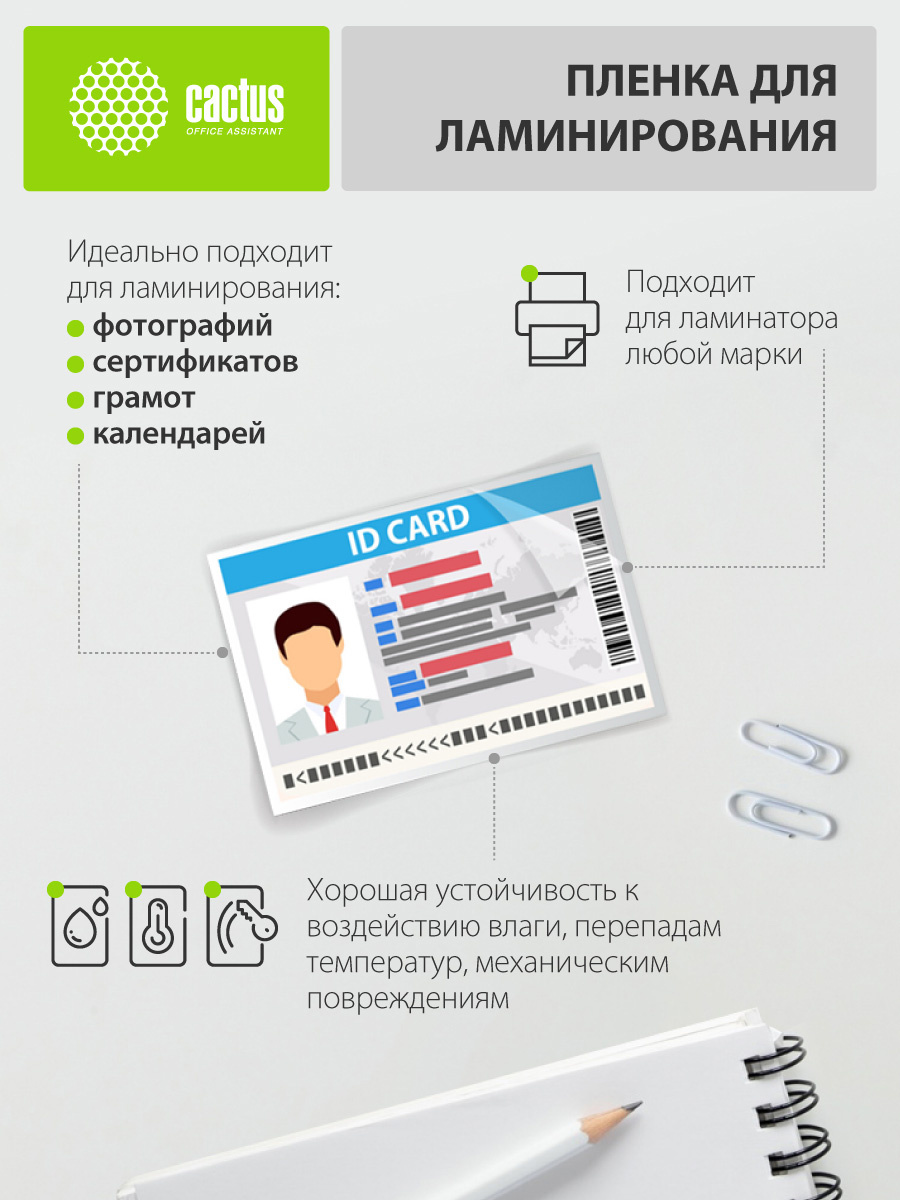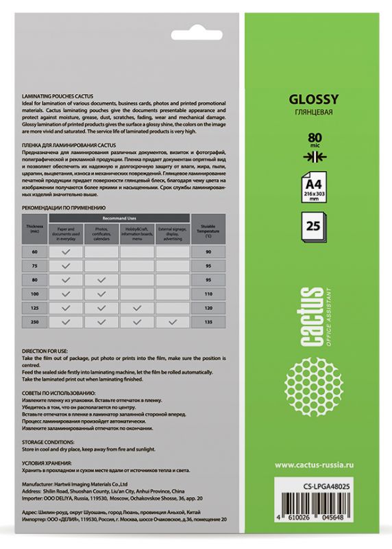 Пленка предназначена для ламинирования различных документов, визиток и фотографий, полиграфической и рекламной продукции. Пленка придает документам опрятный вид и позволяет обеспечить их надежную и долгосрочную защиту от влаги, жира, пыли, царапин, выцветания, износа и механических повреждений. Срок службы ламинированных изделий значительно выше, чем у аналогичных. Глянцевое ламинирование печатной продукции придает поверхности глянцевый блеск, благодаря чему цвета на изображении получаются более яркими и насыщенными.