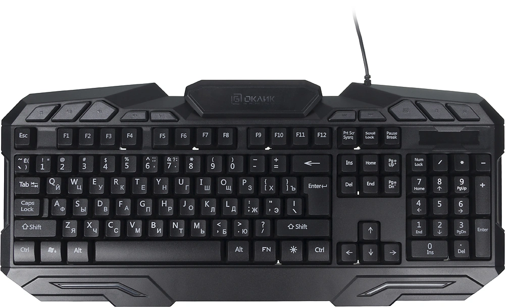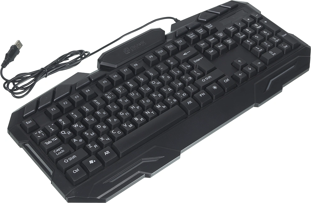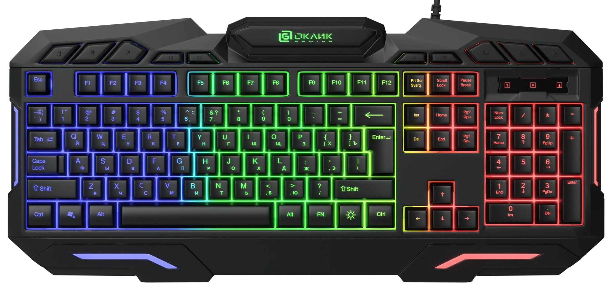 Игровая клавиатура Oklick 700G DYNASTY выполнена в эффектном и агрессивном геймерском дизайне. Модель отличается выразительной многоцветной регулируемой подсветкой: можно настраивать разные уровни яркости и цветовые варианты.