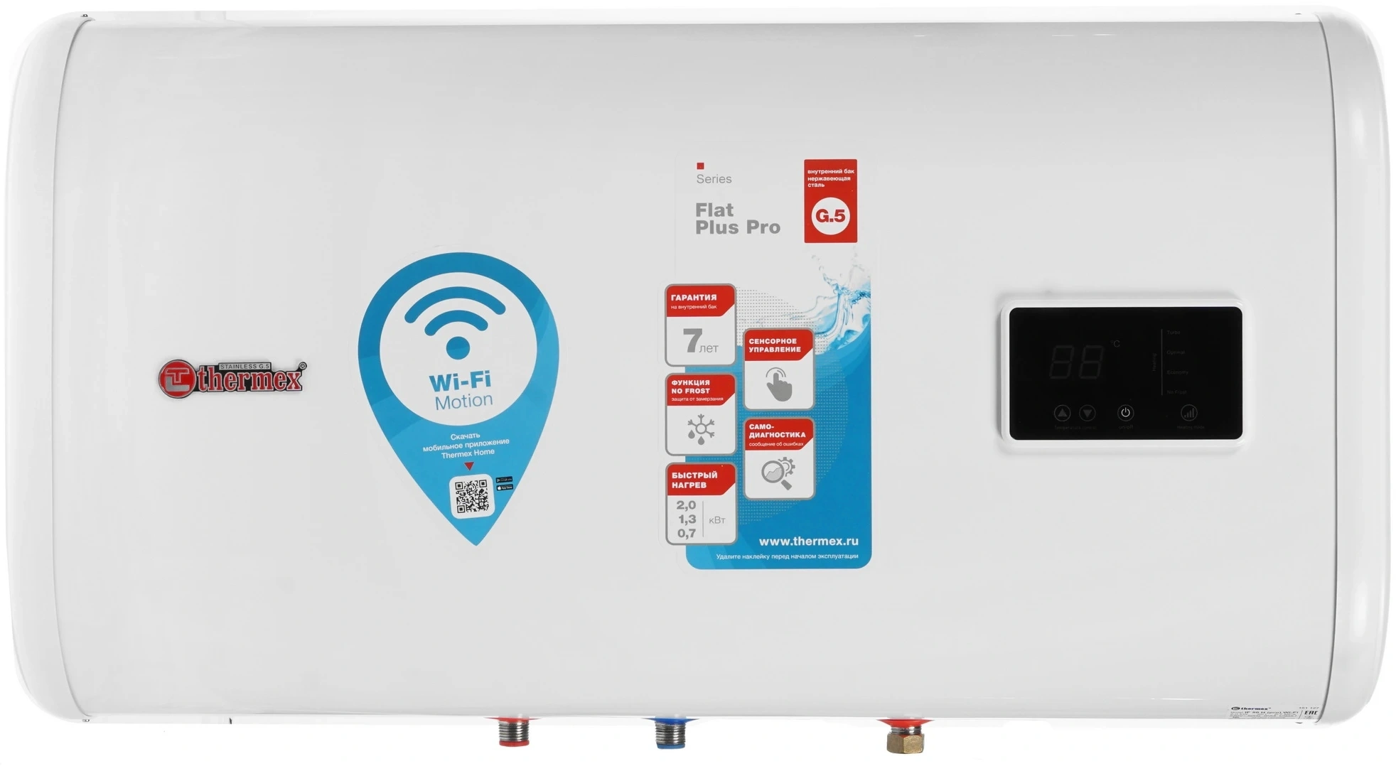 Современный водонагреватель, продолжение легендарного Flat Plus Pro. В этой модели собраны лучшие технологии Thermex: плоский дизайн, стойкие к коррозии нержавеющие внутренние баки и удобное сенсорное управление.