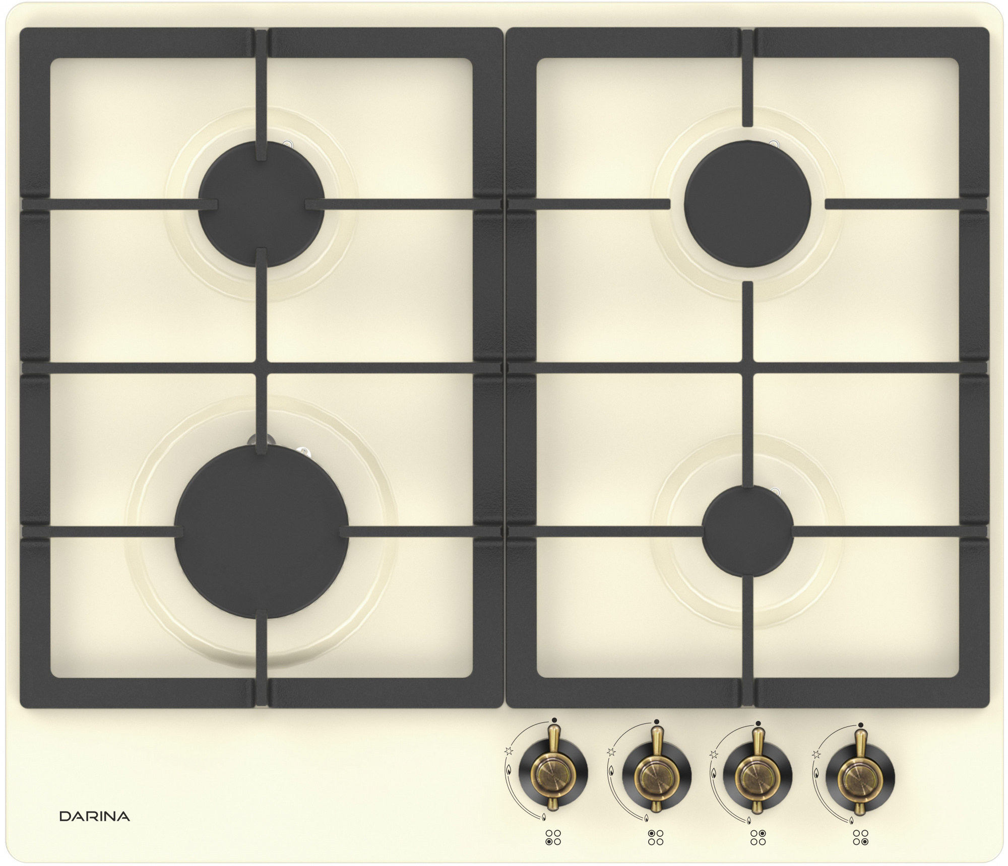 Стиль "Provence" с классическим расположением горелок, материал поверхности эмалированная сталь, с чугунными решетками. Фиксированное положение "Малое пламя"; Интегрированный электророзжиг горелок стола; Комплект для перевода на сжиженный газ.