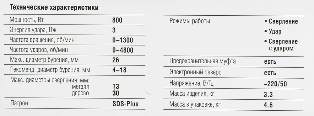 дополнительная рукоятка, ограничитель глубины сверления, предохранительная муфта, реверс