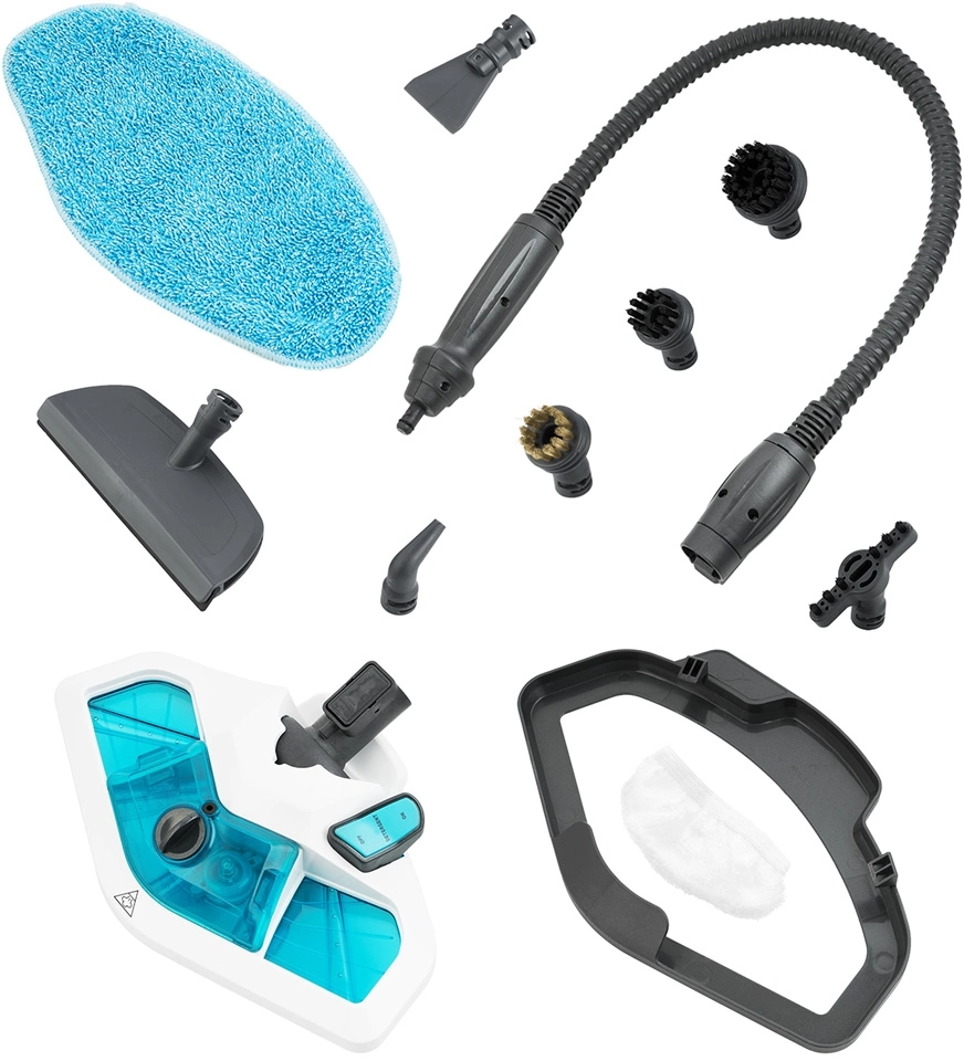 Ручной модуль, базовый блок, удлинительная ручка, щетка для пола, тряпка для пола, рамка для ковра, круглые нейлоновые щетки - 3 шт., угловая насадка, скребок, плоская нейлоновая щетка, насадка для отпаривания, тряпка для отпаривания, удлинительный шланг.