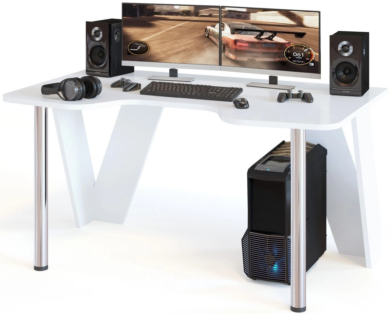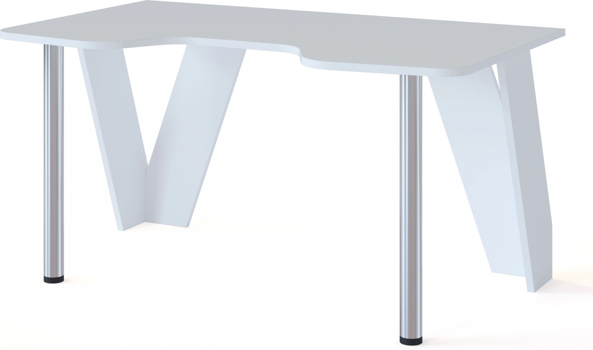 Вырез в столешнице позволяет положить локти на стол, что обеспечивает максимальный комфорт. Прочные ножки из хромированного металла имеют пластиковые накладки, это убережет напольное покрытие от царапин и других повреждений. Широкая столешница для размещения пары экранов, колонок, клавиатуры и т.д.