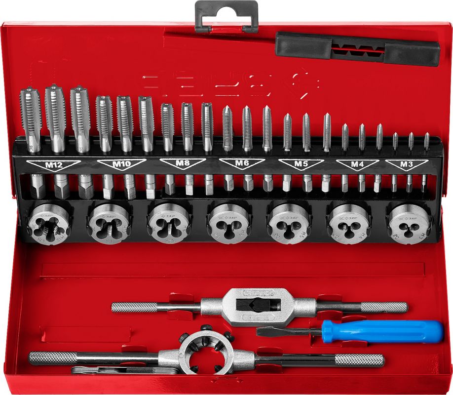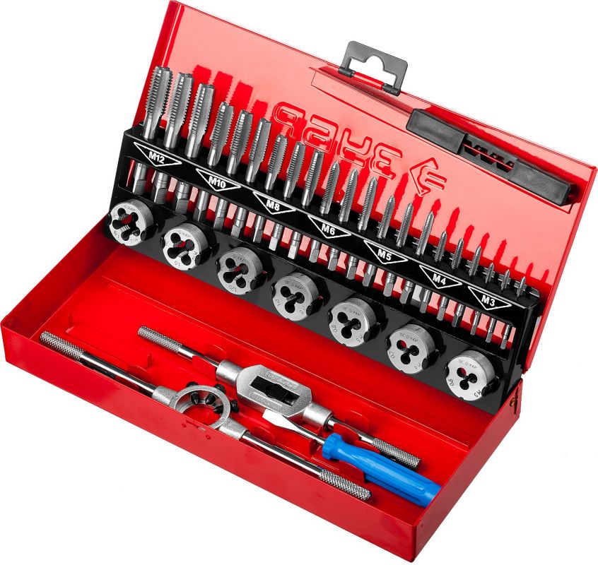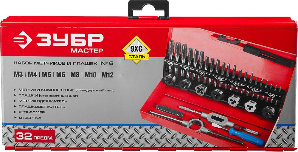 Метчикодержатель М3-М12, плашкодержатель Д25 (М3-М12), резьбомер, отвертка.
