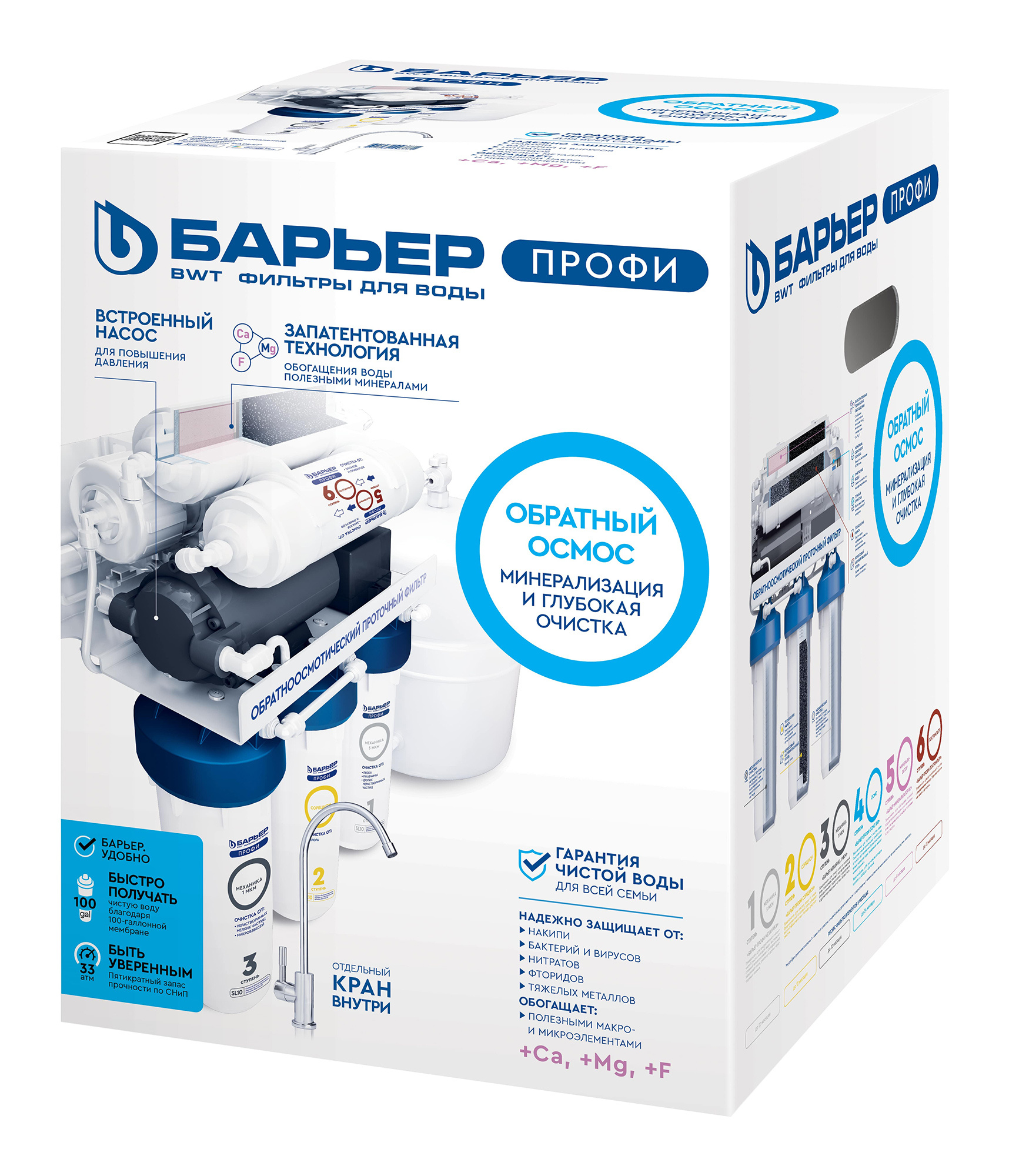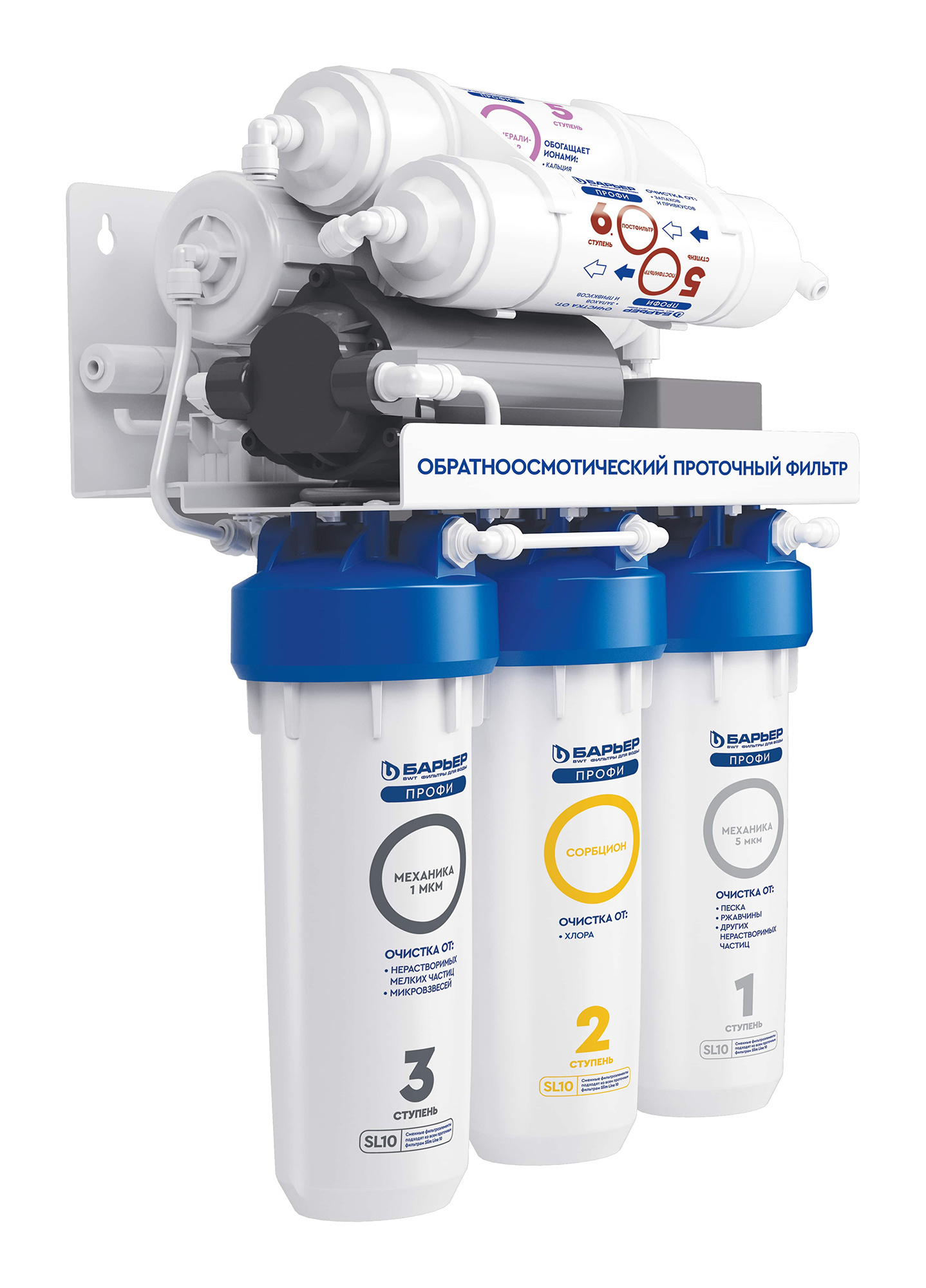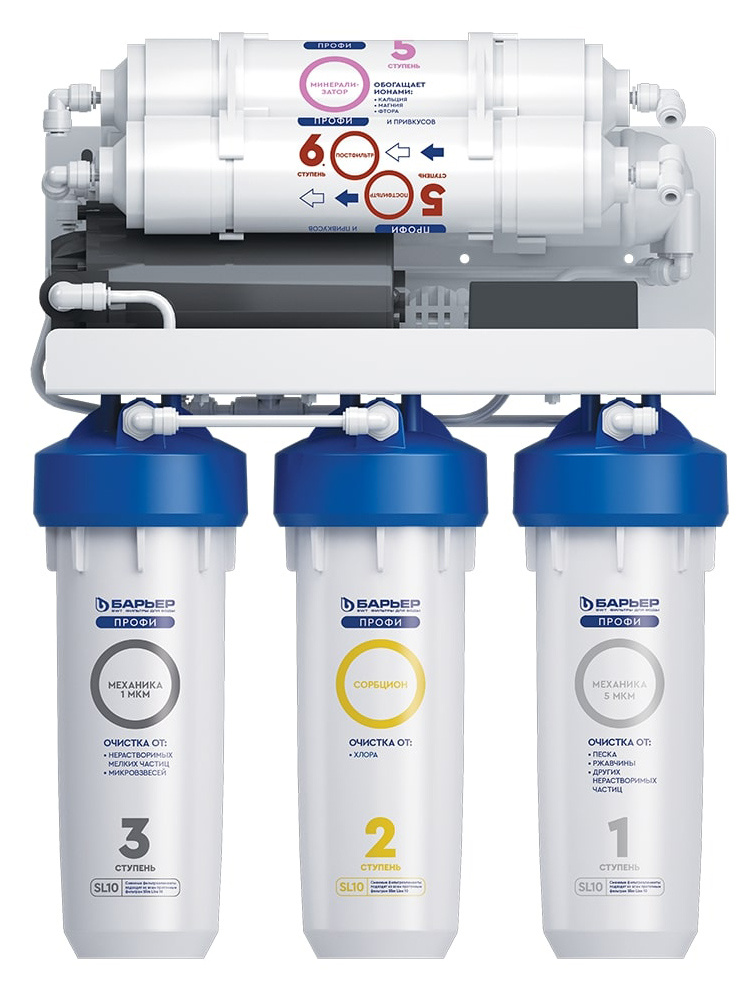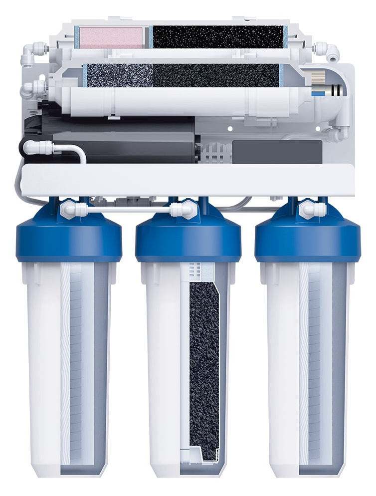 6-ти ступенчатый классический обратноосмотический фильтр с минерализатором и насосом повышения давления.