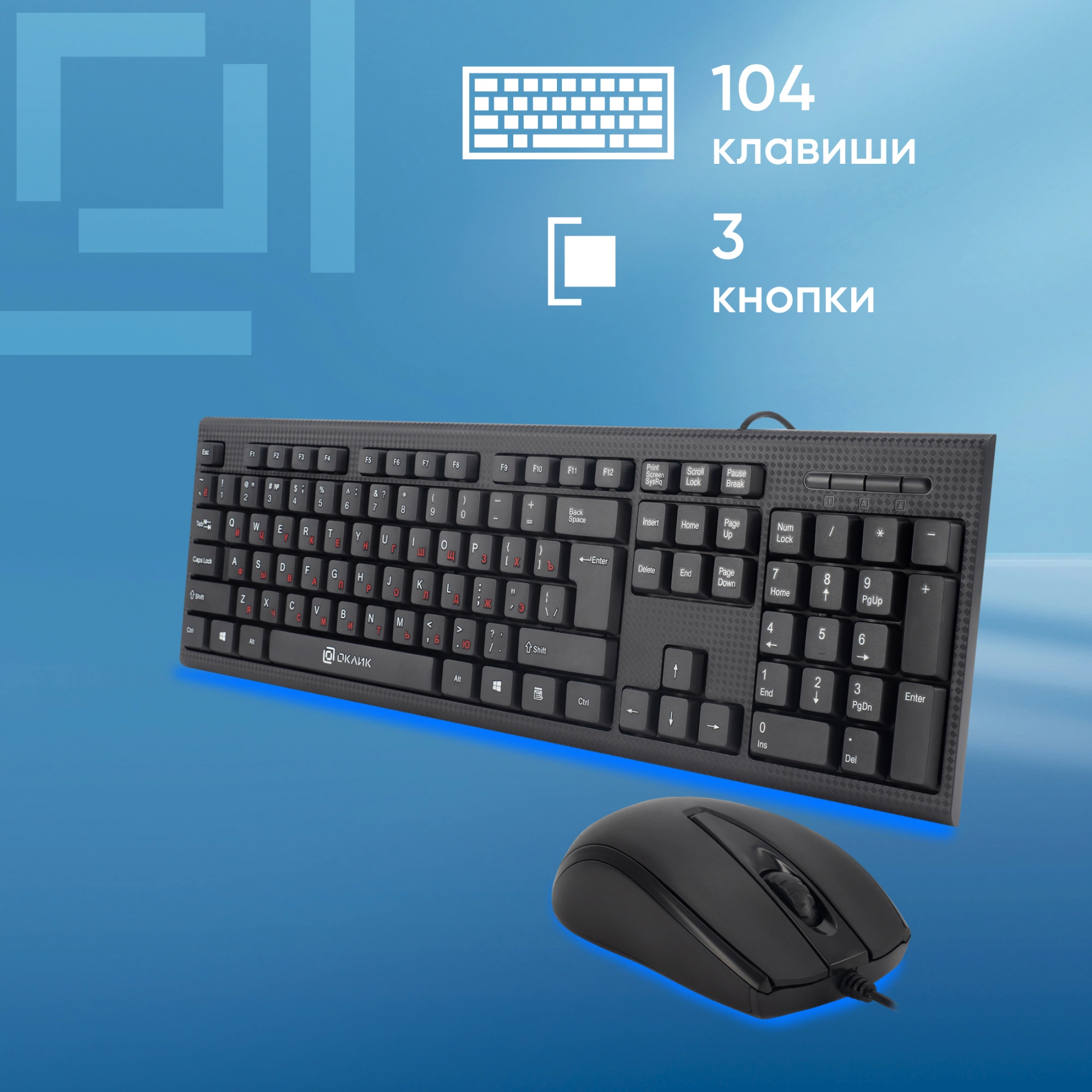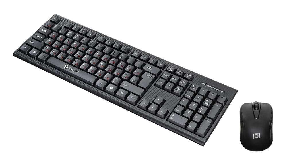 Мышь и клавиатура выполнены в классическом дизайне чёрного цвета. Клавиши отличаются квадратной формой. Шрифт – двухцветный, что удобно при работе с вводом текста. Английские буквы выделены белым цветом, а русские – красным.