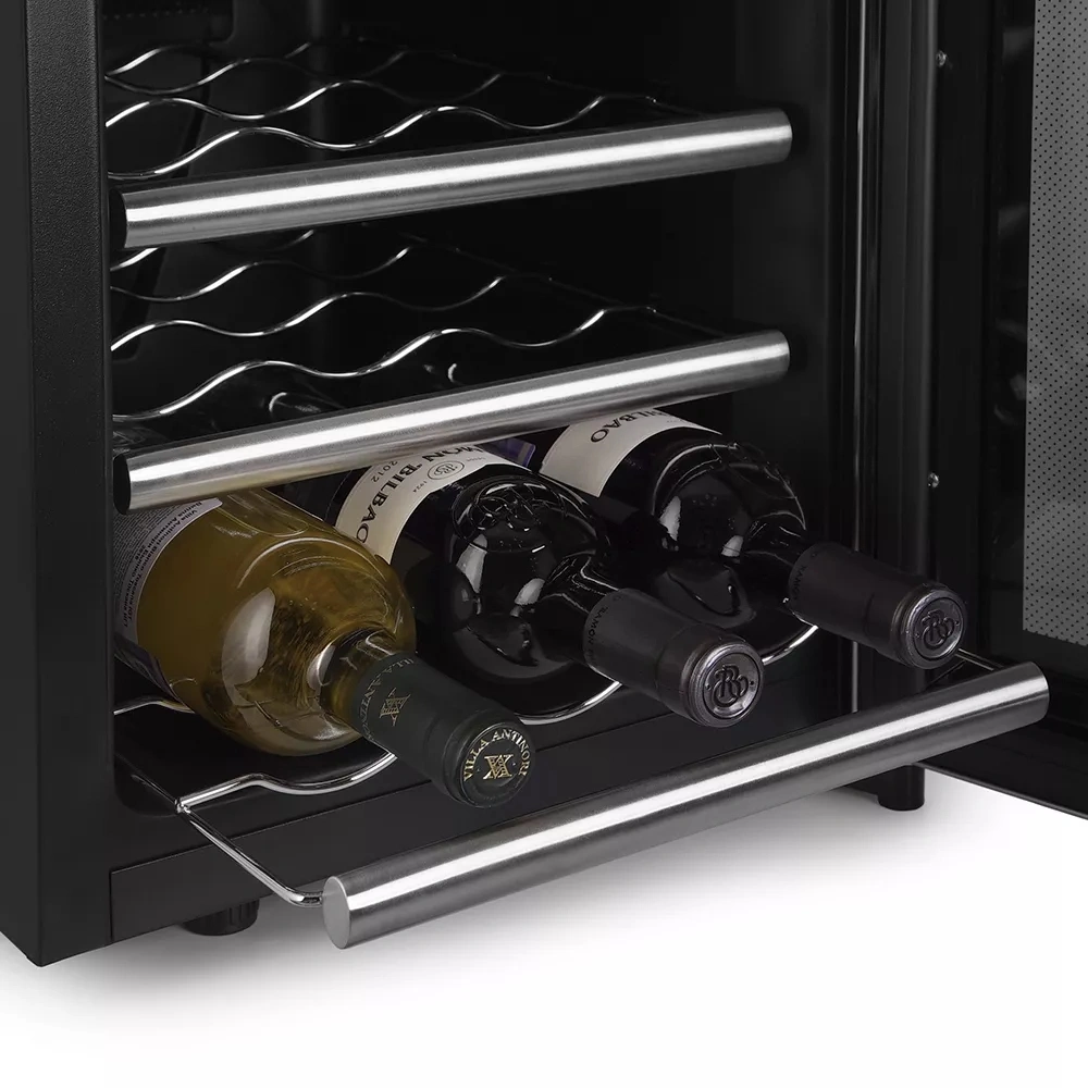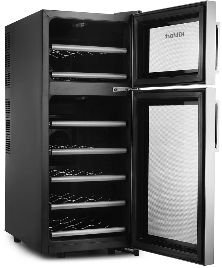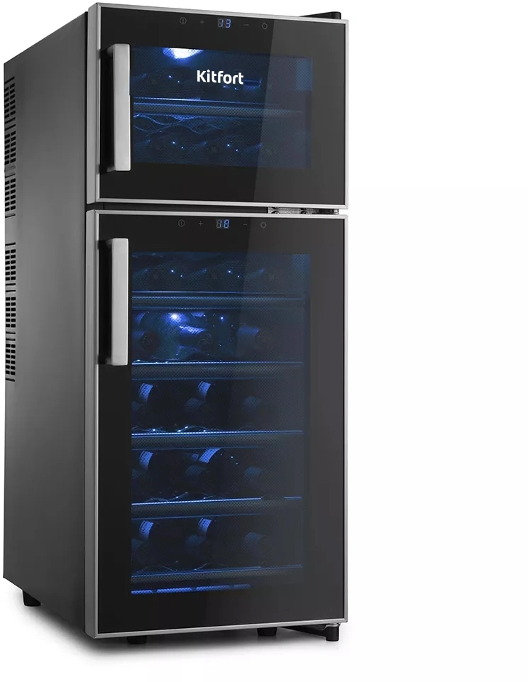 Вместимость: 21 бутылка, 2 индивидуальные вентилируемые зоны для красного и белого вина, индивидуальное управление и освещение, максимальная разница температур 18 градусов, мощность 140 Вт.