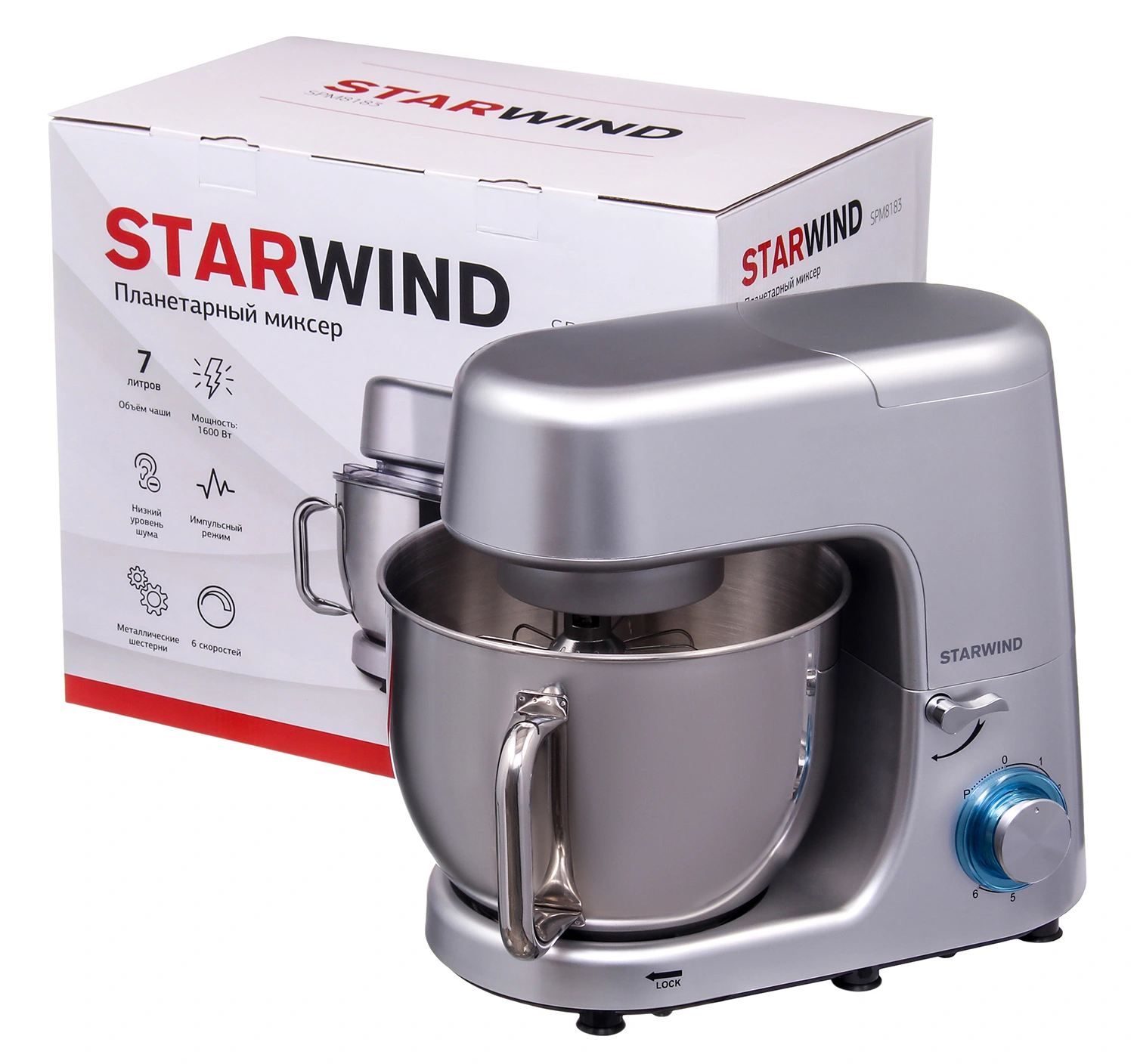 Планетарный миксер STARWIND SPM8183 имеет мощность 1600 Вт и чашу объемом 7 литров. Он подойдет как для личного, так и профессионального использования. Все погружные элементы выполнены из прочного металла и гарантируют долговечность работы прибора.
