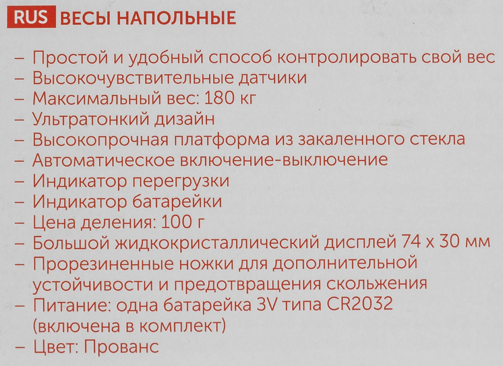 Благодаря высокочувствительным датчикам погрешность составит не более одной цены деления: 100 г. Максимальный вес: 180 кг. Ультратонкий дизайн обеспечит компактное хранение. Материал платформы - высокопрочное закаленное стекло