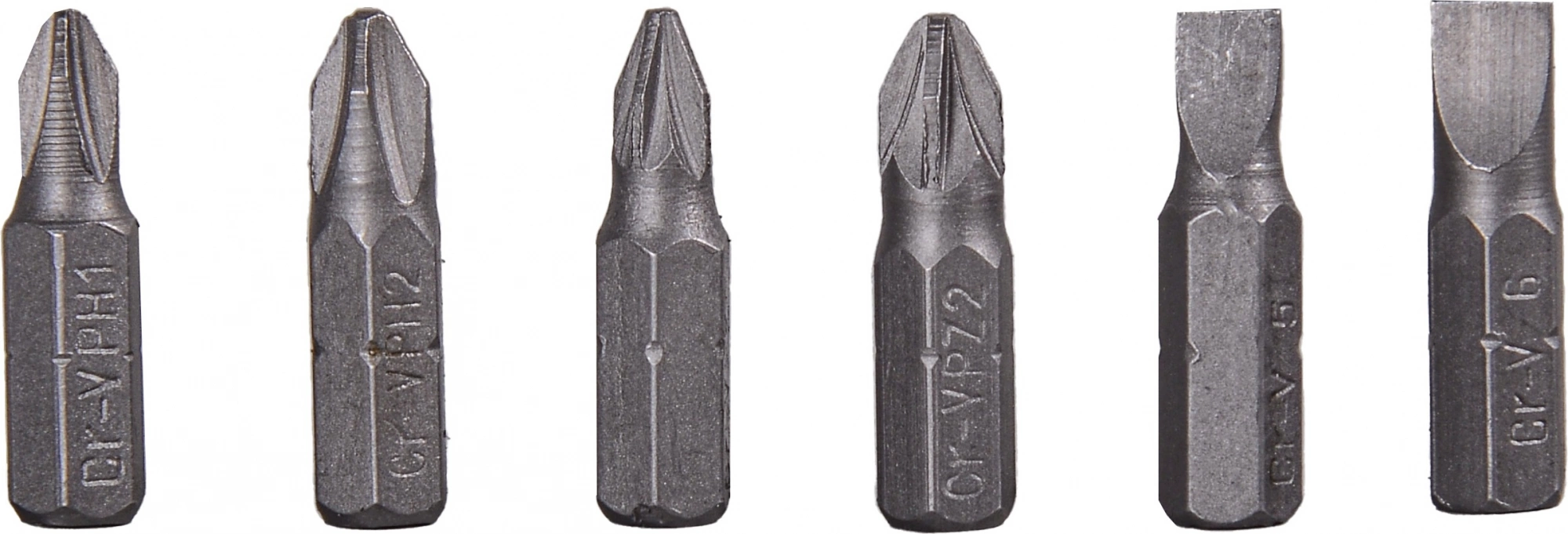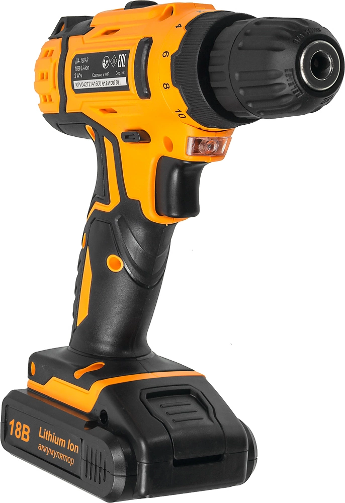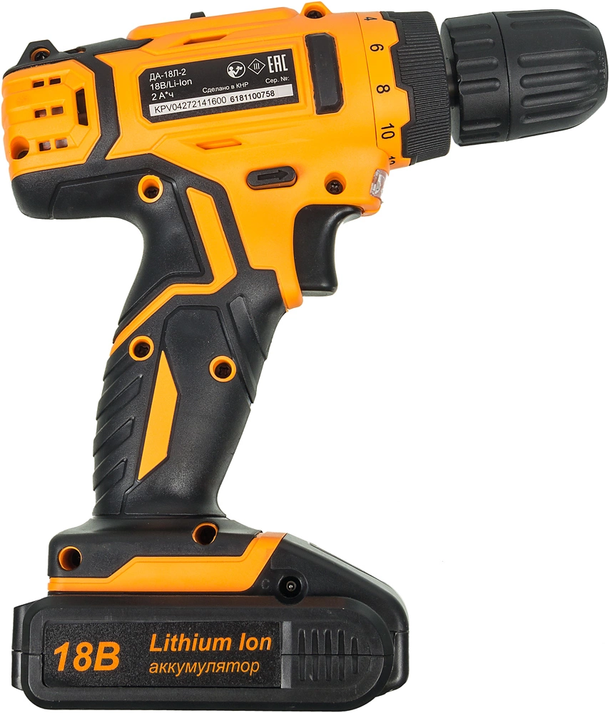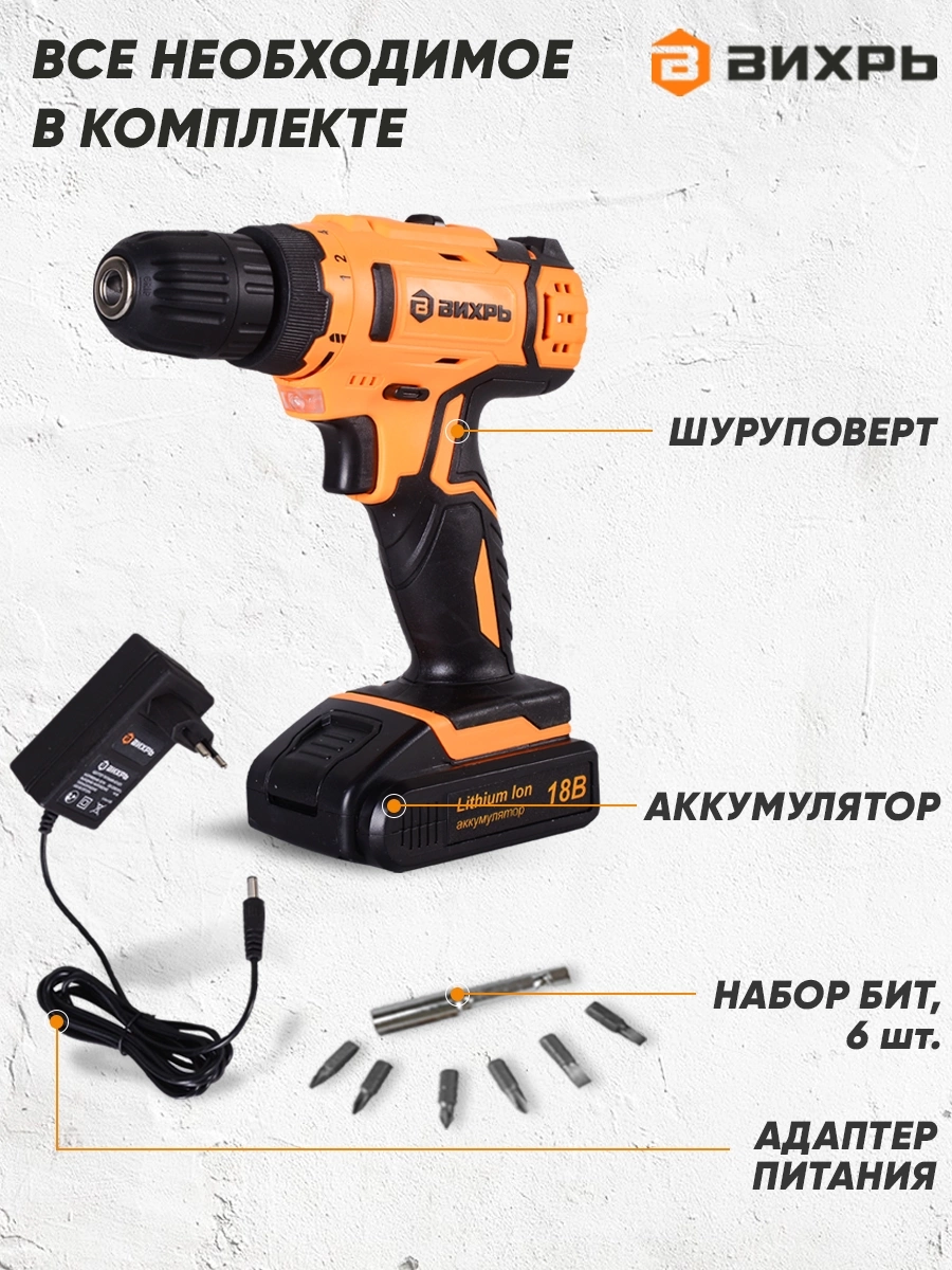 Дрель-шуруповерт, бита 6шт., адаптер-удлинитель для бит, адаптер питания, зарядное устройство, паспорт (инструкция)