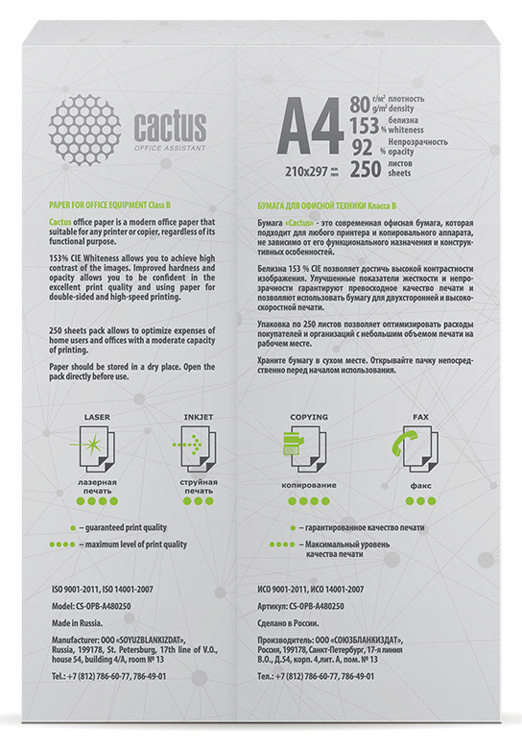 Бумага для офисной техники Cactus CS-OPB-A480250 – это современная офисная бумага класса B, которая подходит для любого принтера и копировального аппарата, не зависимо от его функционального назначения и конструктивных особенностей.