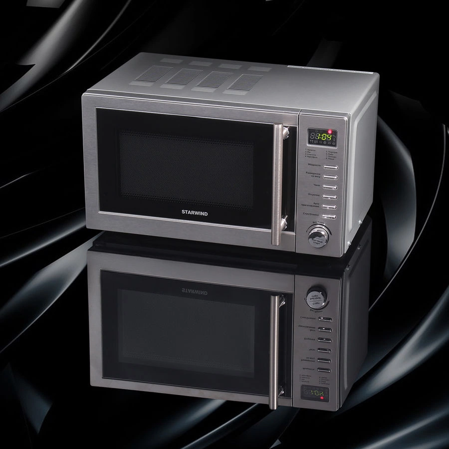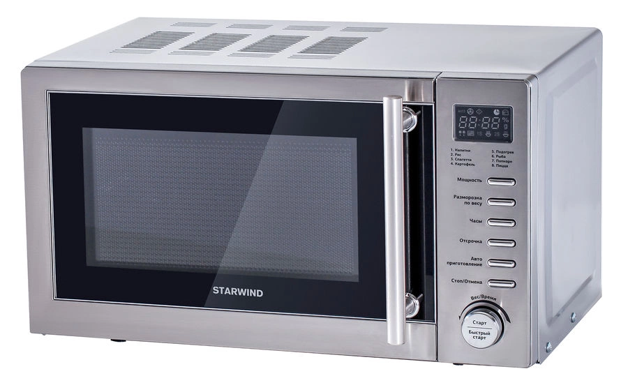 Микроволновая печь STARWIND SMW5320 выполнена в стильном современном дизайне. Корпус серого цвета в сочетании с элементами управления в серебристом цвете позволят идеально вписаться в дизайн любой кухни. Панель управления расположена в правой части прибора. Вверху находится обширная перфорация для вывода горячего воздуха во время работы печи. В нижней части предусмотрены 4 ножки, защищающие поверхность, на которую устанавливается прибор, от повреждений.