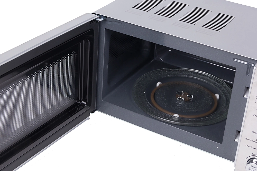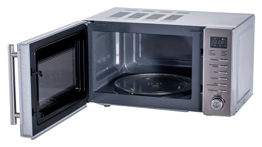 Дверца открывается с помощью нажатия кнопки, которая также является кнопкой запуска «СТАРТ». Объем внутренней камеры составляет 20 литров, а диаметр поворотного стола – 245 мм. Питание осуществляется от сети 220 В переменного тока с помощью съемного кабеля.