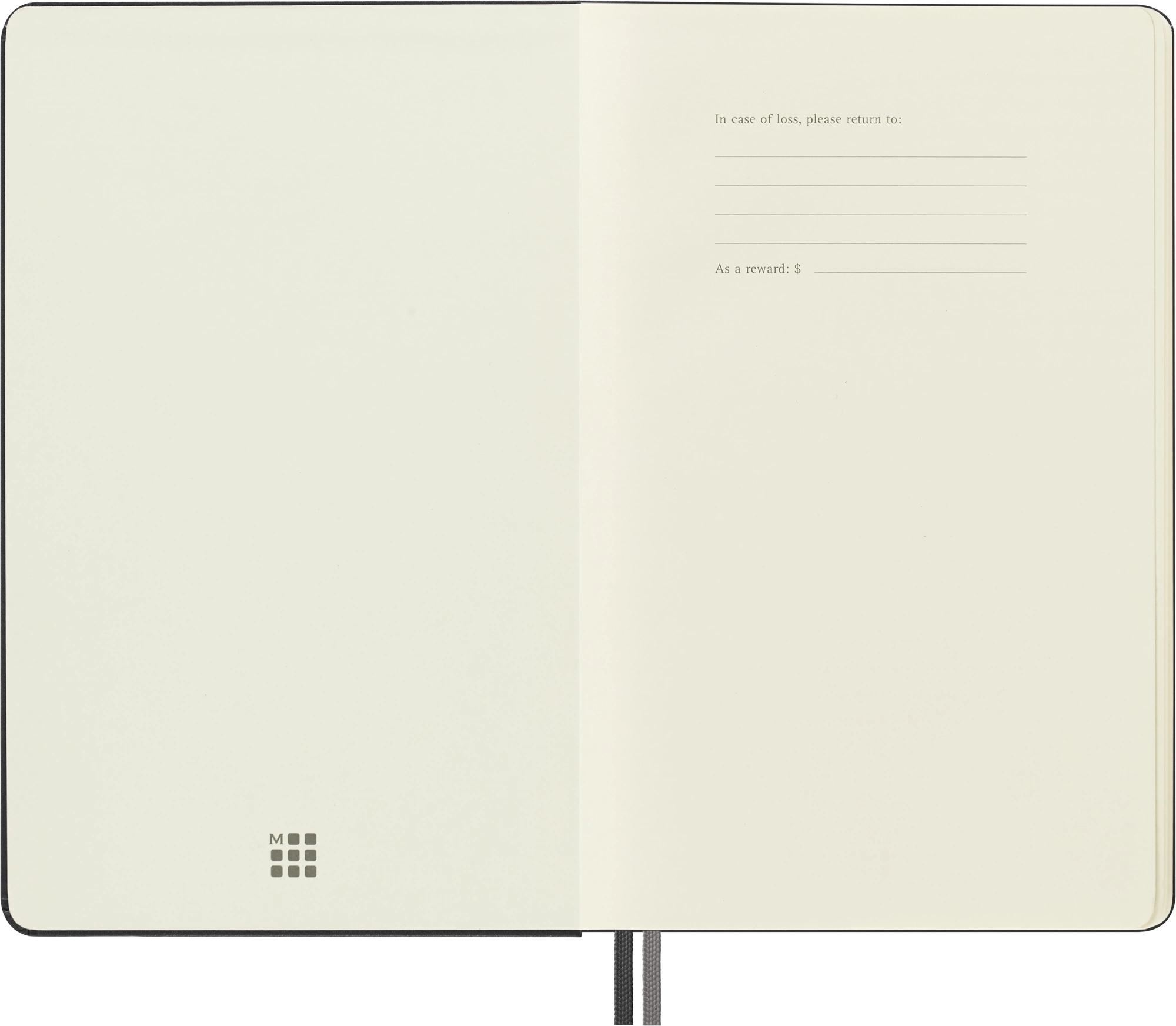В дизайне увеличенной записной книжки Classic использованы знаменитые фирменные элементы Moleskine: закругленные углы, расширяемый внутренний кармашек для отдельных записок, сделанных на ходу, эластичная застежка подходящего цвета, чтобы ваши идеи пребывали в сохранности, а также специальная надпись «In case of loss», где можно указать свои контактные данные и награду для того, кто найдет ваши драгоценные записи.