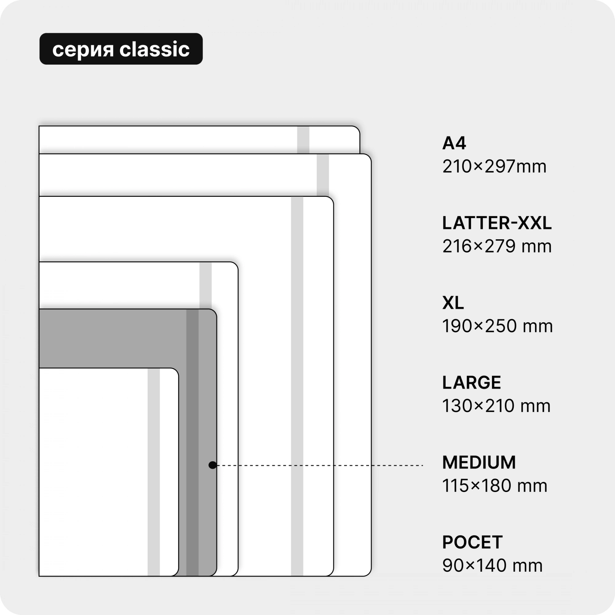Достаточно маленькая, чтобы поместиться в любую сумку, достаточно большая, чтобы вместить великие идеи. Новая записная книжка Classic среднего размера от Moleskine имеет закругленные углы для защиты от повреждений в дороге и эластичную застежку для сохранности записанных вашей рукой мыслей и творческих идей. Подходящая по цвету лента-закладка помогает не забыть о ваших проектах, а в расширяемый внутренний кармашек удобно складывать разные заметки, сделанные в течение дня. Под оригинальной надписью «In case of loss» на переднем форзаце можно указать свое имя, контактные данные и уведомление о вознаграждении на случай, если вы где-то потеряете свои важные заметки.