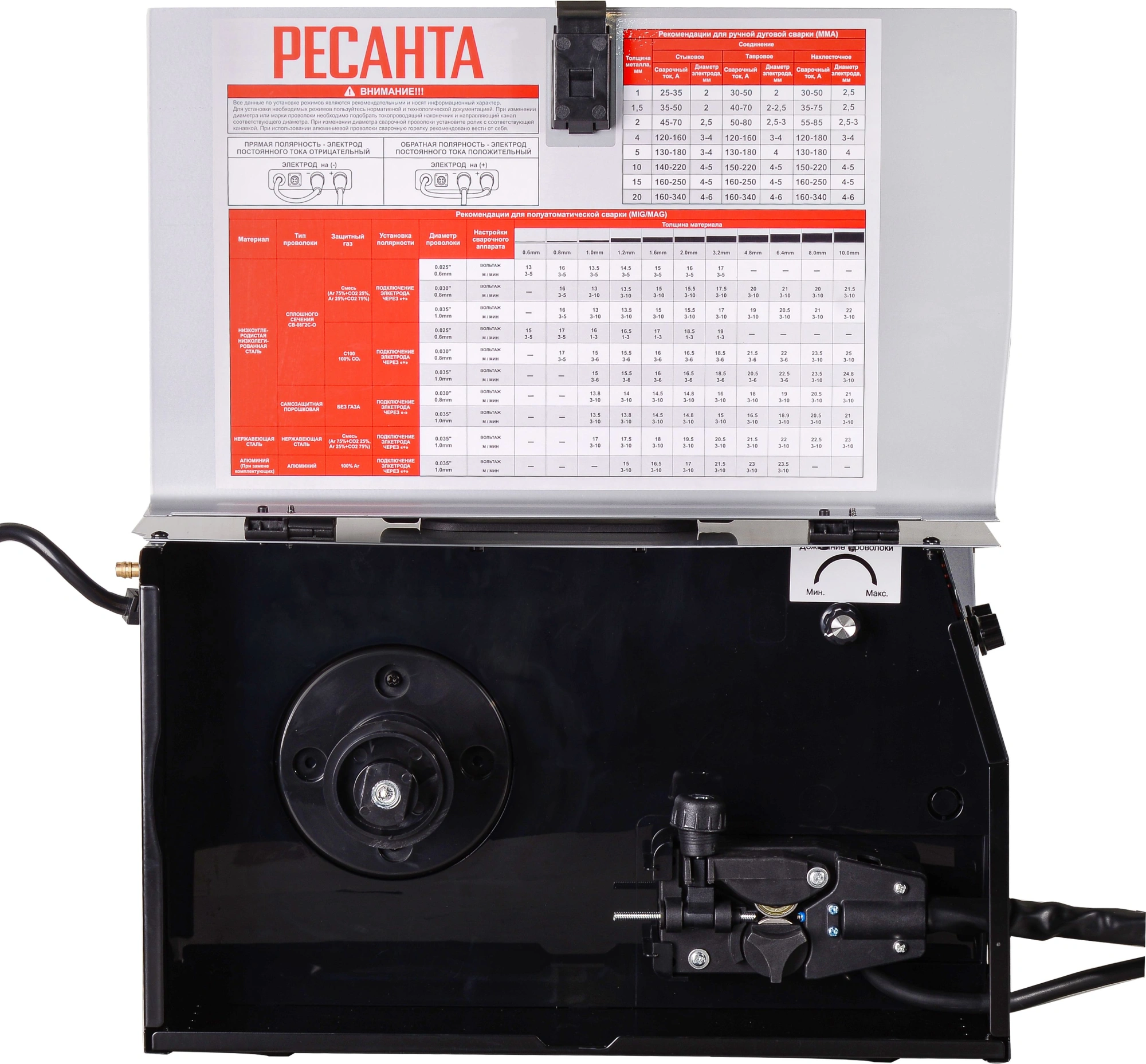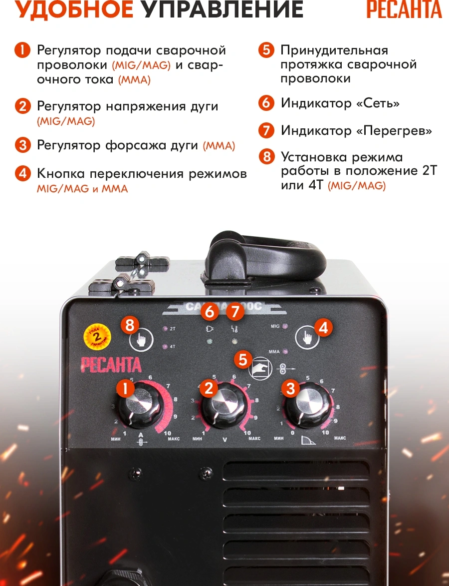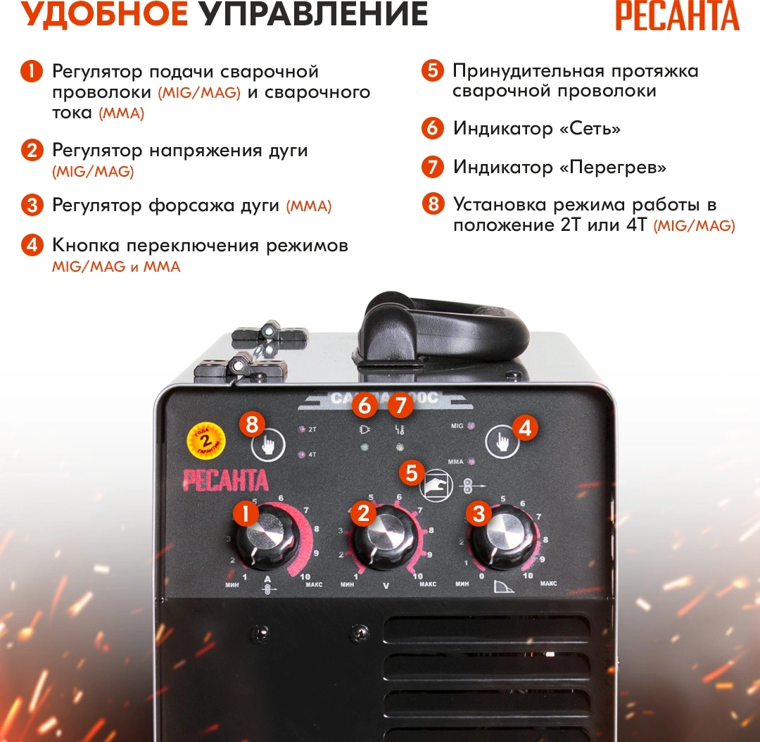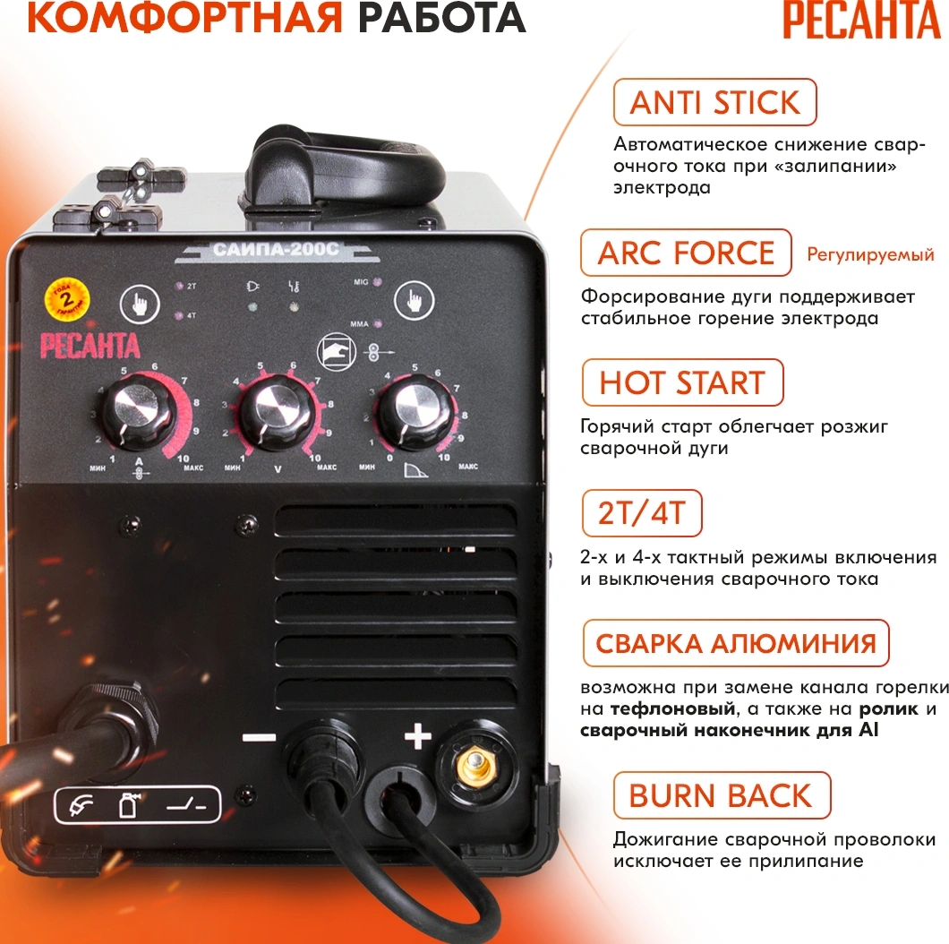 Дополнительно оборудована функция сварки ММА (помимо MIG/MAG). Класс защиты IP 21, то есть "от крупных частиц и отвесных дождевых капель". Защита от перегрева и пониженного напряжения сети, что позволяет уберечь аппарат от поломки. Горелка несъемная.