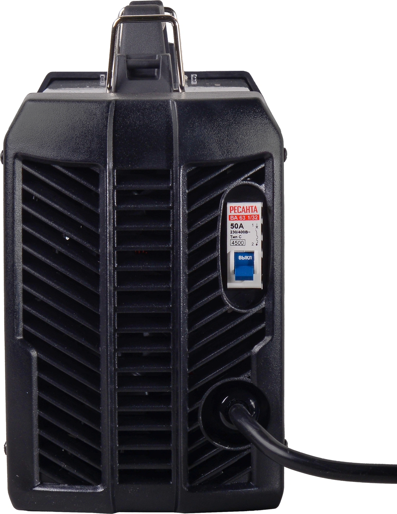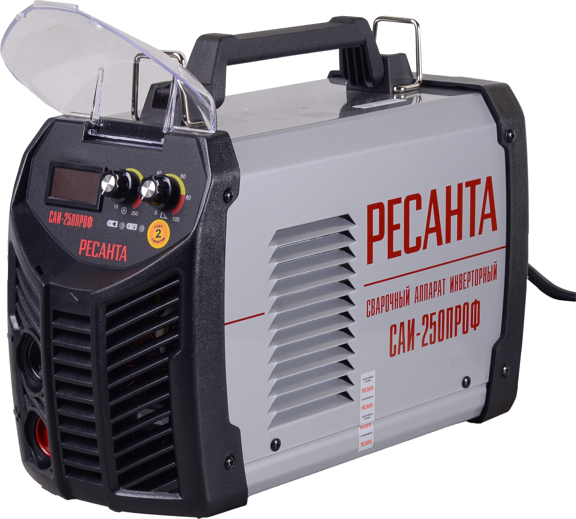 Сварочный аппарат «Ресанта», кабель с электрододержателем, кабель с клеммой заземления, паспорт, упаковка.