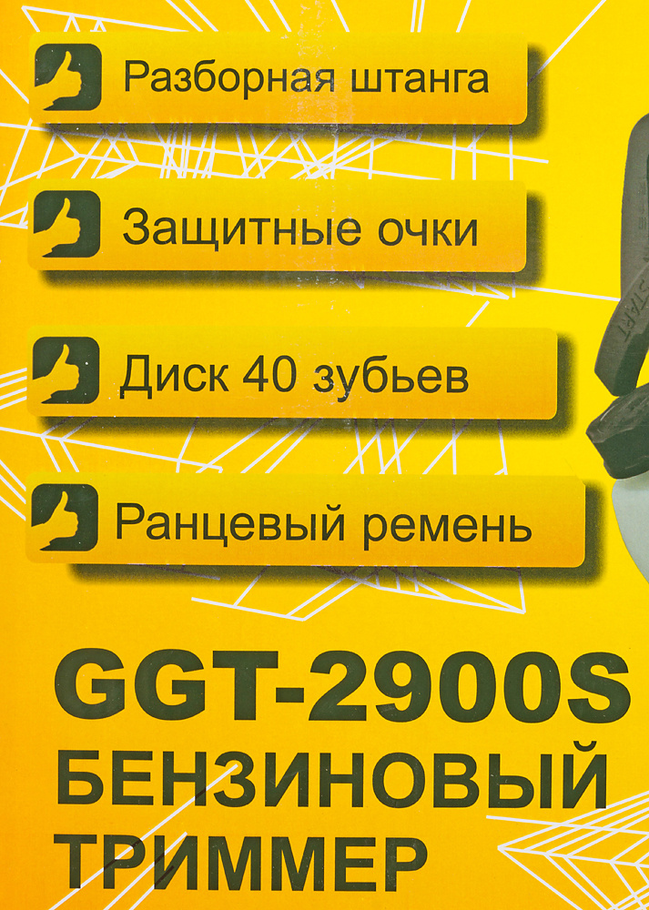 Двигатель в сборе, штанга, защитный кожух, режущий диск 40ТР, катушка с леской, рукоятки управления(левая и правая), ранцевый ремень, комплект ключей, защитные очки, инструкция