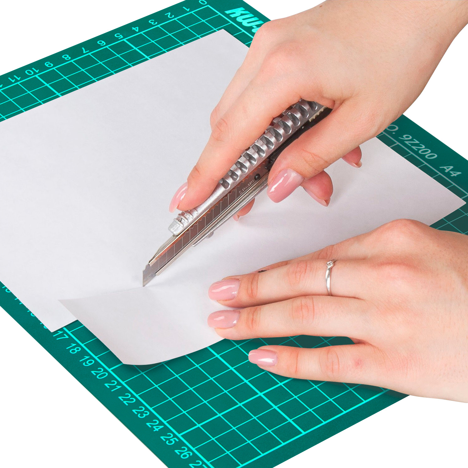 Коврик для резки KW-triO, изготовленный из трехслойного пластика, используется для защиты поверхностей и сохранения остроты режущих кромок лезвий ножей. Имеет разлиновку на лицевой поверхности. Применяется при работе с макетными и циркульными ножами.