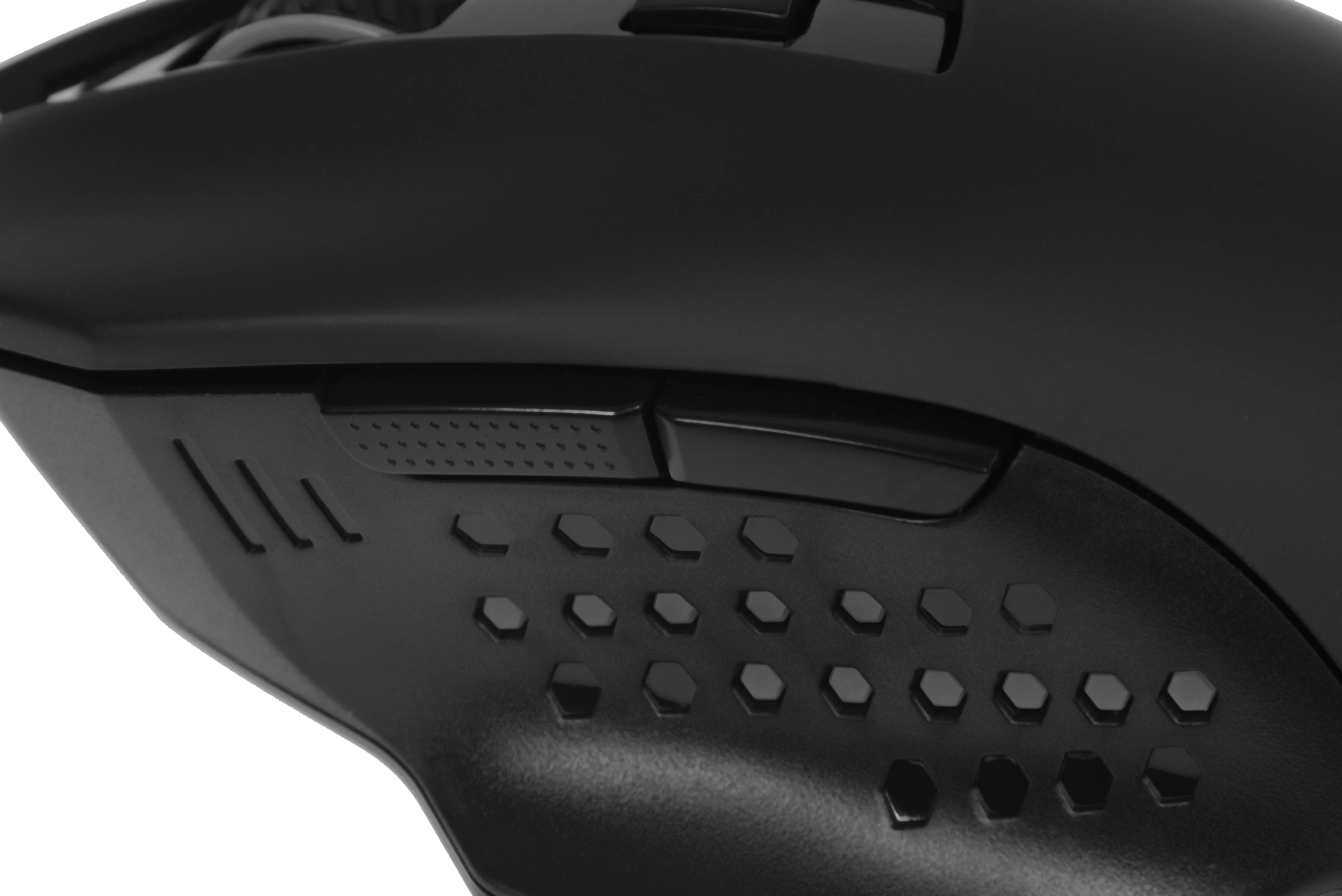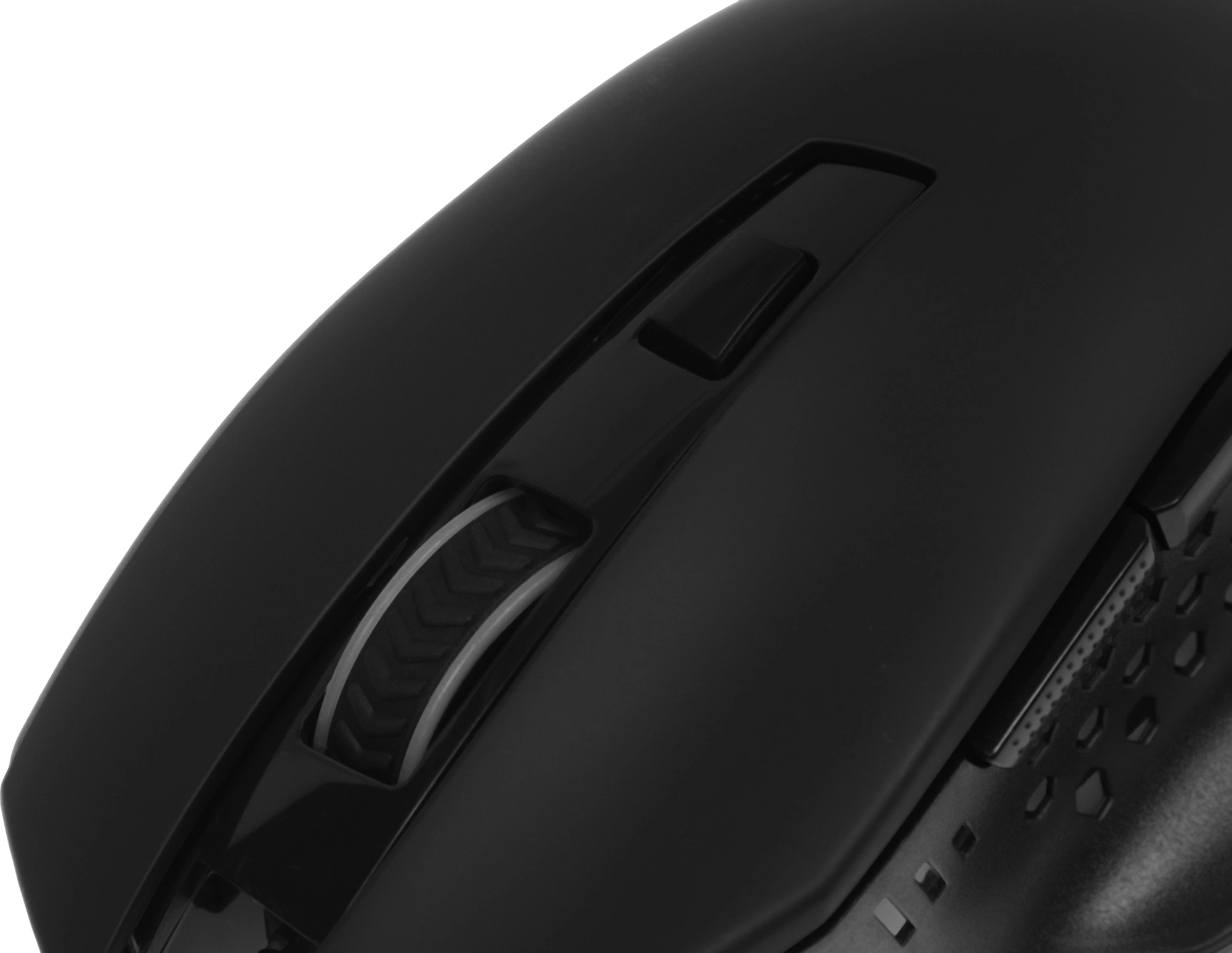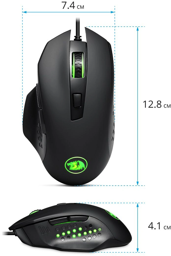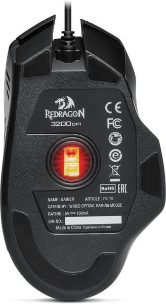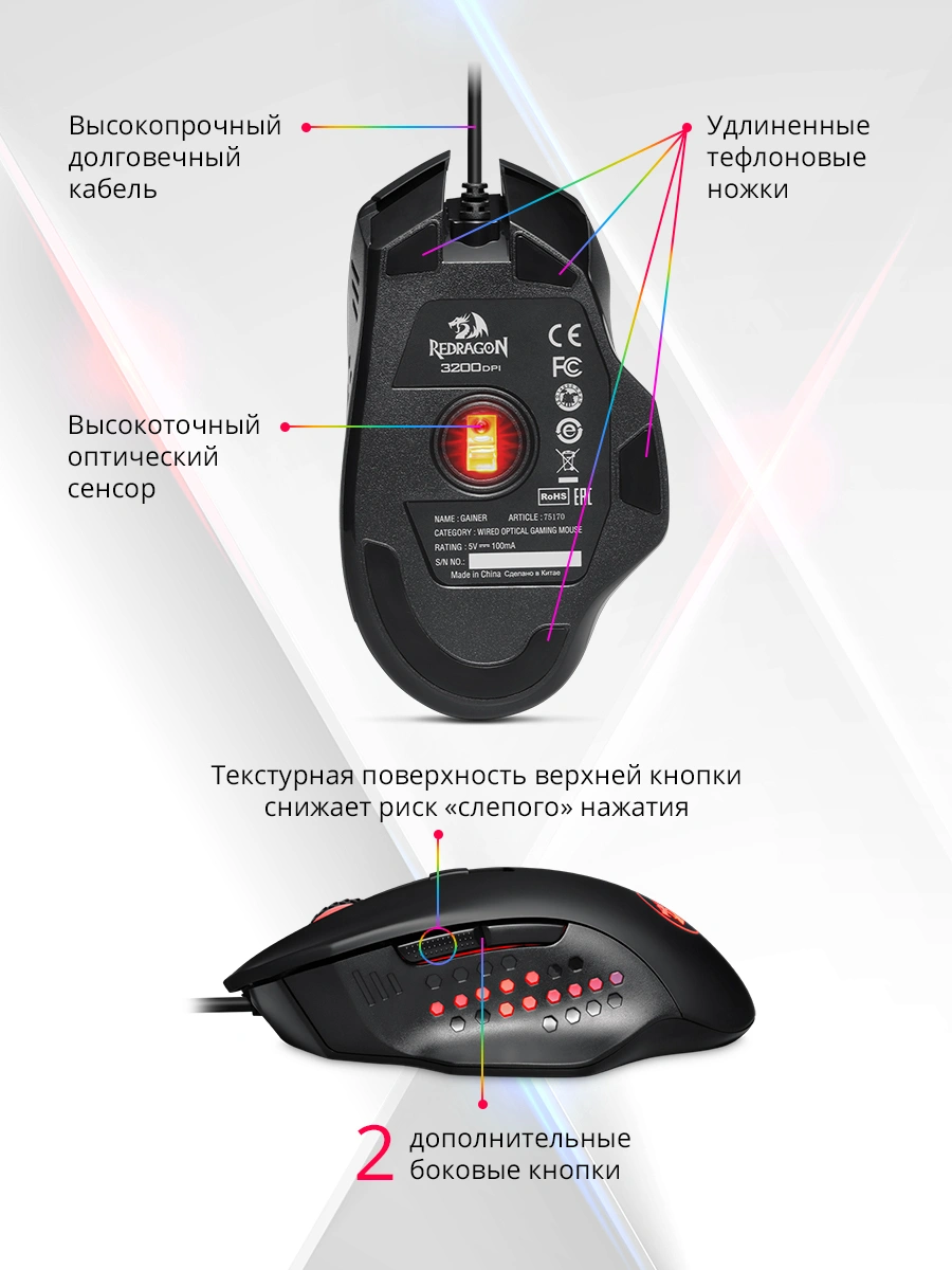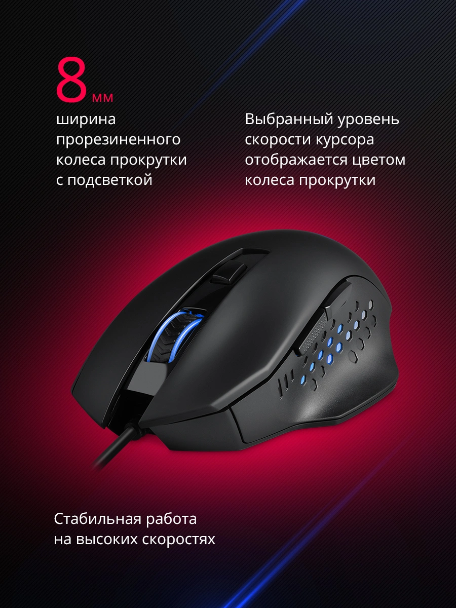 Широкое прорезиненное колесо прокрутки шириной 8 мм с подсветкой. Высокопрочный долговечный кабель. Отображение уровня DPI. Удлиненные тефлоновые ножки.