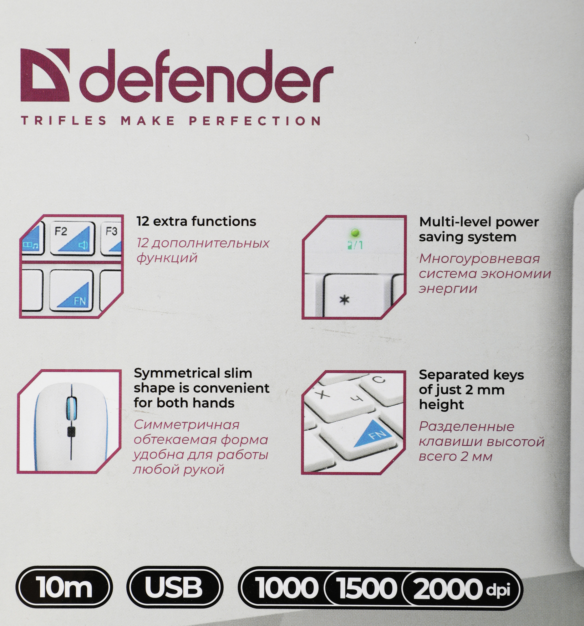 12 дополнительных функций, активируются клавишей FN.Разделенные клавиши высотой всего 2 мм. Многоуровневая система экономии энергии.