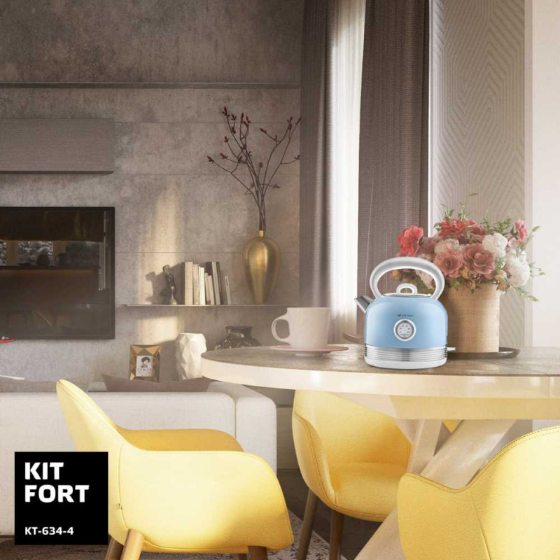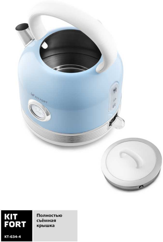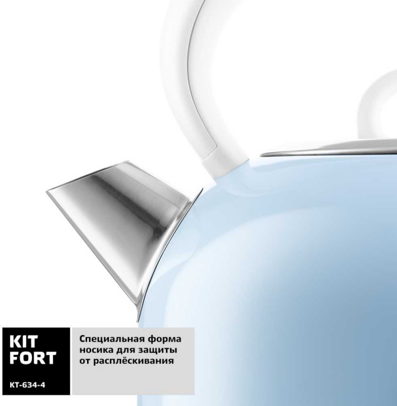 Мощность чайника позволяет использовать его в домах со слабой проводкой. Корпус чайника и подставка выполнен из сочетания металла и пластика, а подставка — из пластика. Мерная шкала находится на корпусе выше кнопки включения.