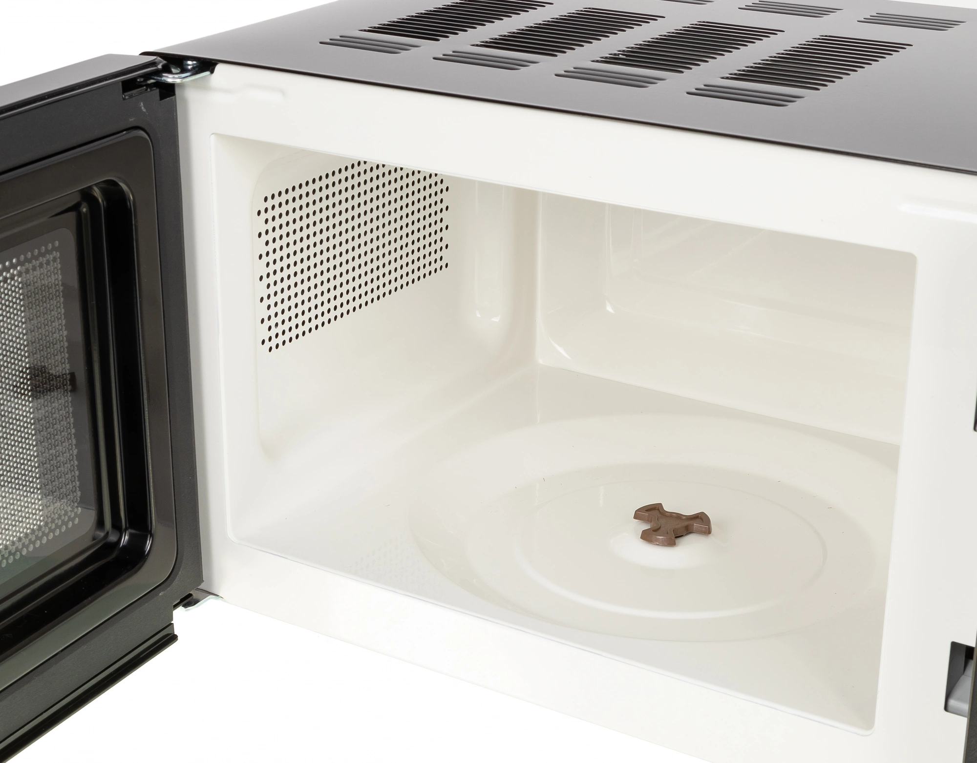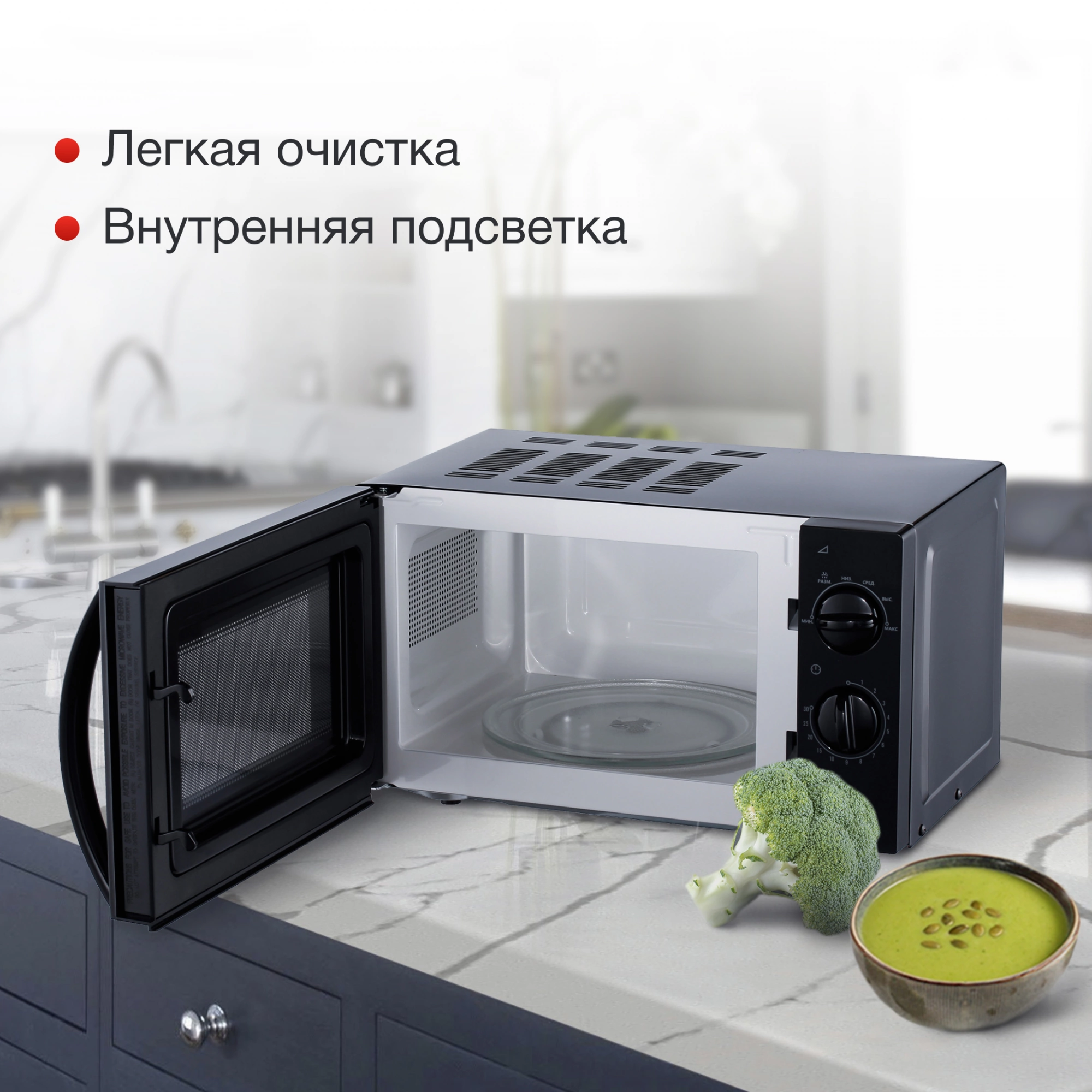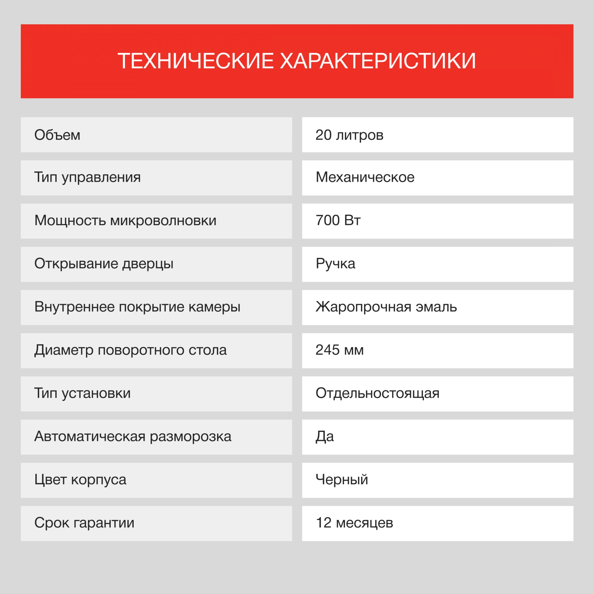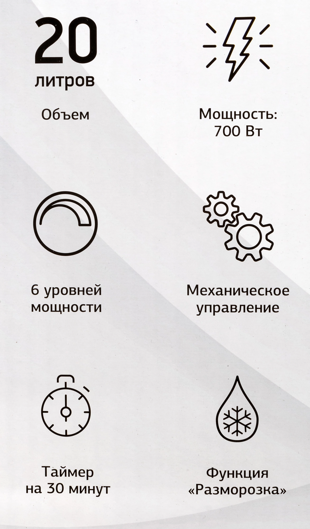 Тип управления – механический, с помощью двух тумблерных переключателей, позволяющих установить мощность работы, а также время, необходимое на приготовление или разогрев. В данной модели также предусмотрена и функция разморозки. Переключатели расположены в правой части от дверцы. Сама же дверца открывается механическим путем, с помощью длиной вертикальной ручки. Корпус печи гладкий, на его верхней части установлена обширная перфорация для вывода горячего воздуха. Камера модели внутри покрыта эмалью, что позволяет легко очищать прибор от загрязнений, а также продлевает срок службы. Диаметр поворотного стола соответствует размеру стандартной тарелки – 24,5 см. Мощности в 700 Вт достаточно для разогрева еды за 1-2 минуты. Гарантийное обслуживание предоставляется на 12 месяцев.