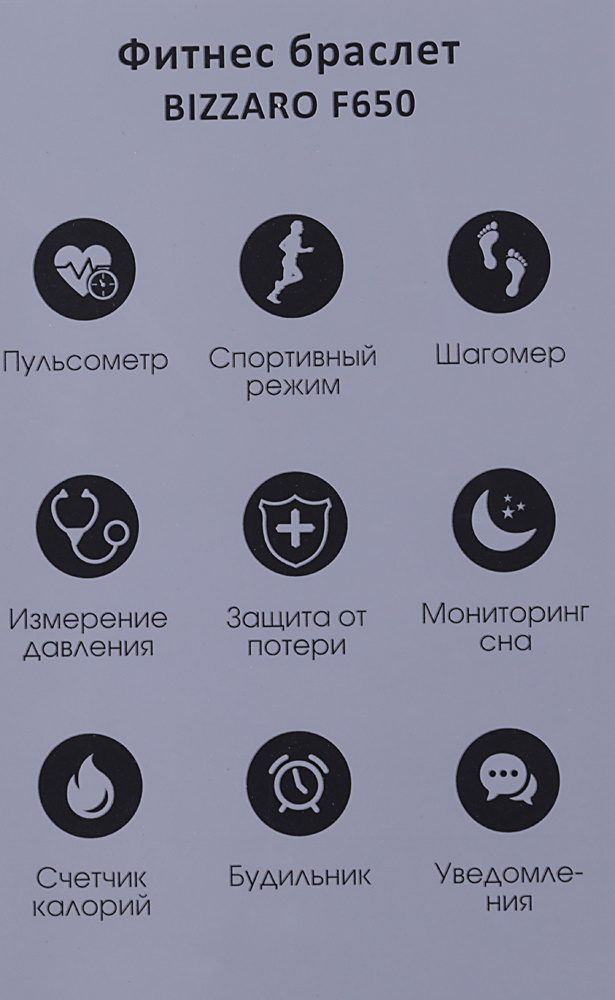 Bizzaro F650 соединяют в себе функции фитнесс-трекера и «умных часов». Работая без соединения со смартфоном, часы отслеживают основные физические показатели – пульс, давление, затраченные калории, а так же пройденные шаги и расстояние.
