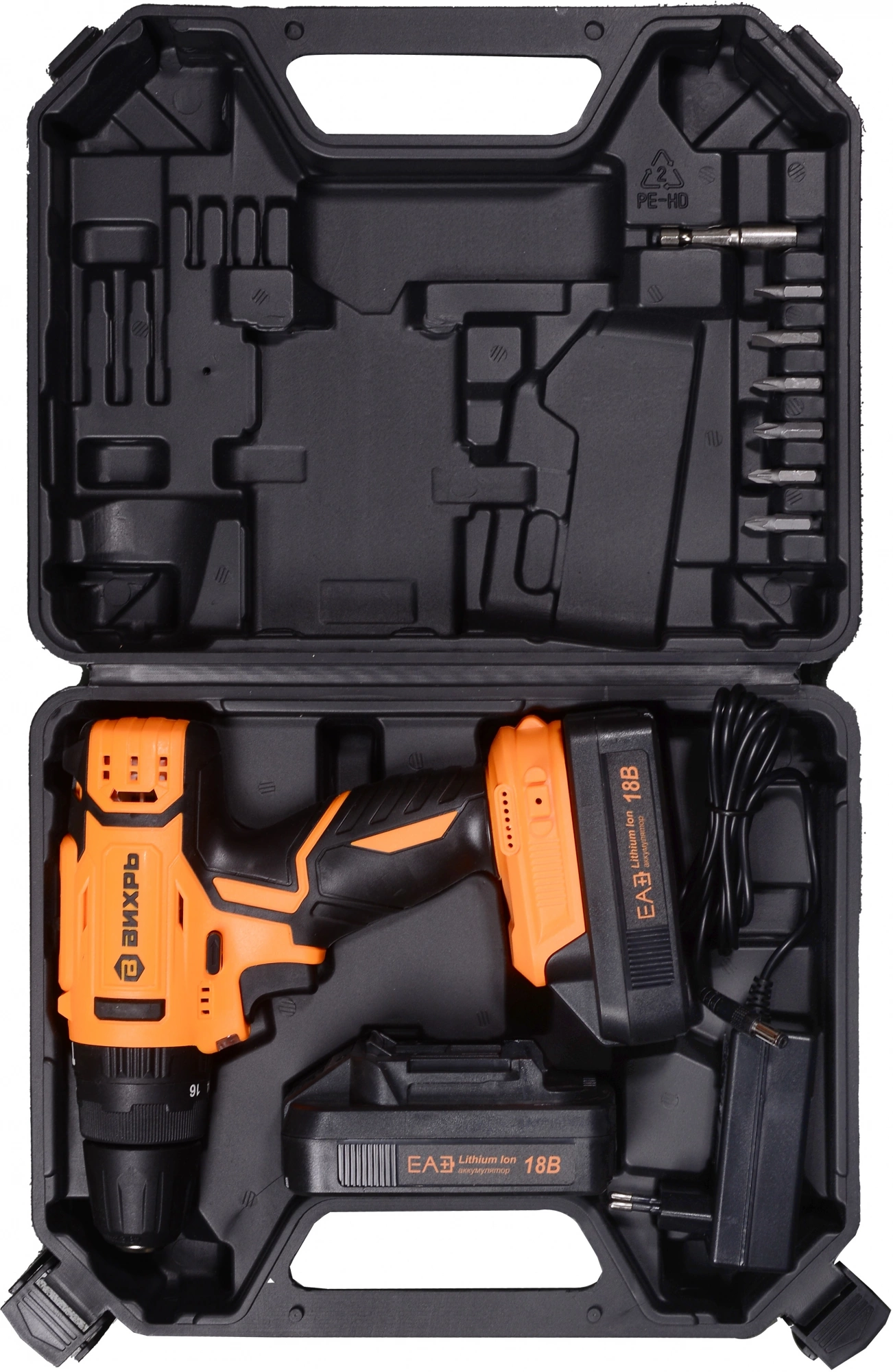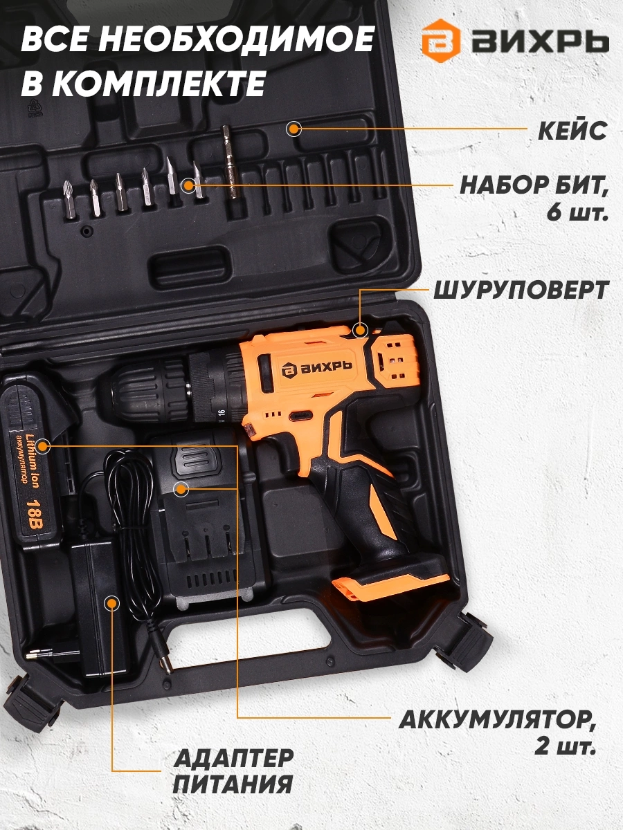 Кейс, шуроповерт, зарядка, 2 аккумулятора, паспорт.