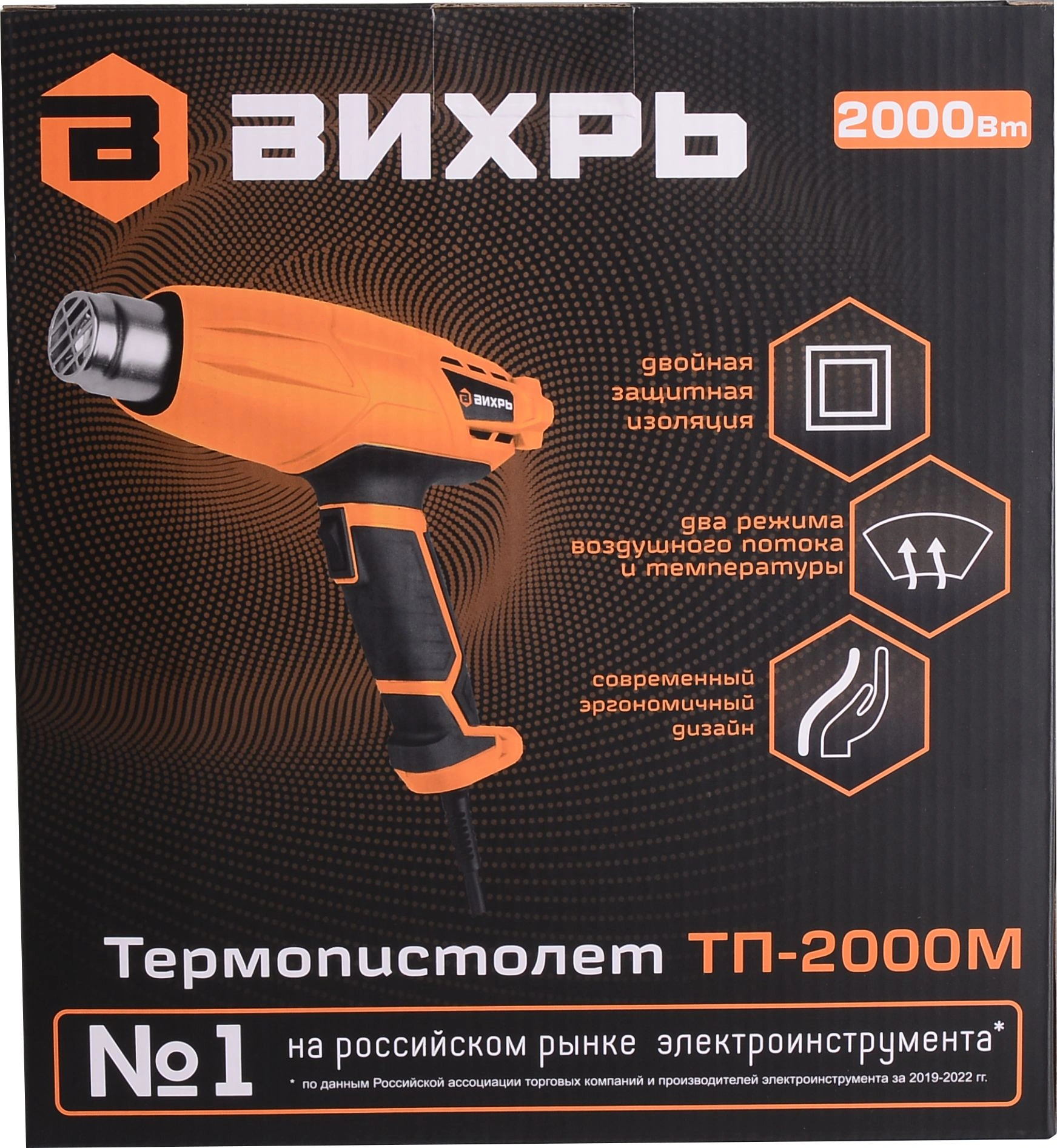 Коробка. Преимущества ТП-2000М: Два режима воздушного потока для более качественной работы; Переключатель находится под указательным пальцем, что позволяет быстро переключать режимы.