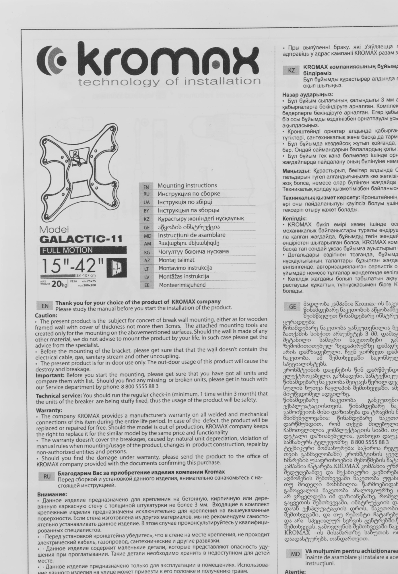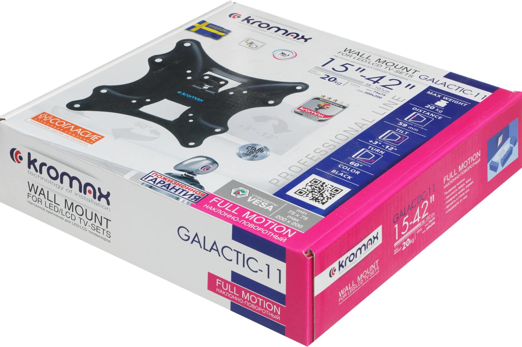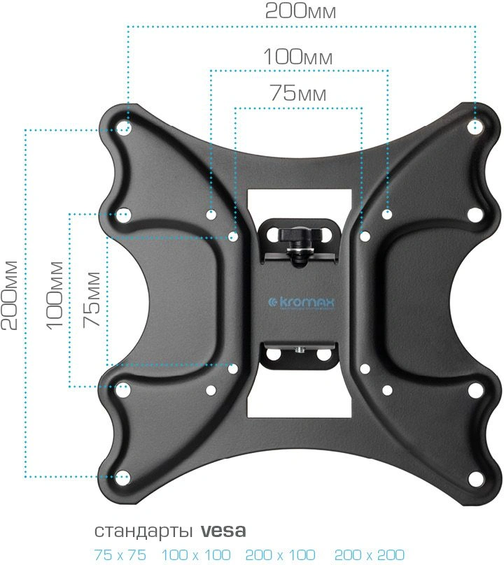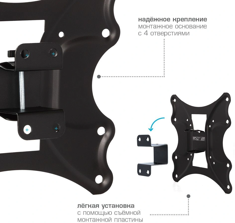 Легкий монтаж при помощи съемной монтажной пластины. Надежная стальная конструкция. Универсальный телевизор на кронштейне можно наклонить, повернуть и сдвинуть к стене. Регулировка угла наклона без использования инструментов.